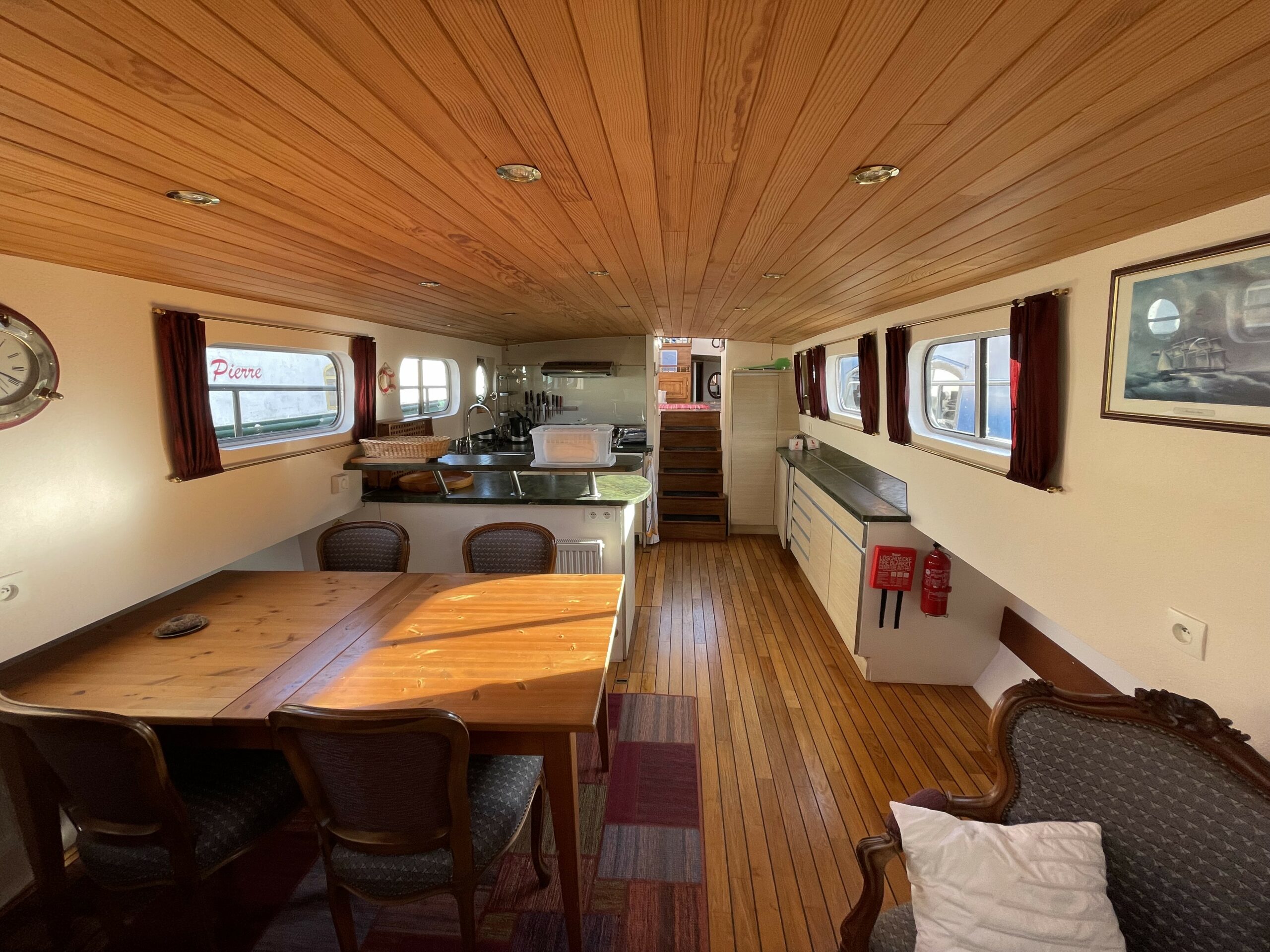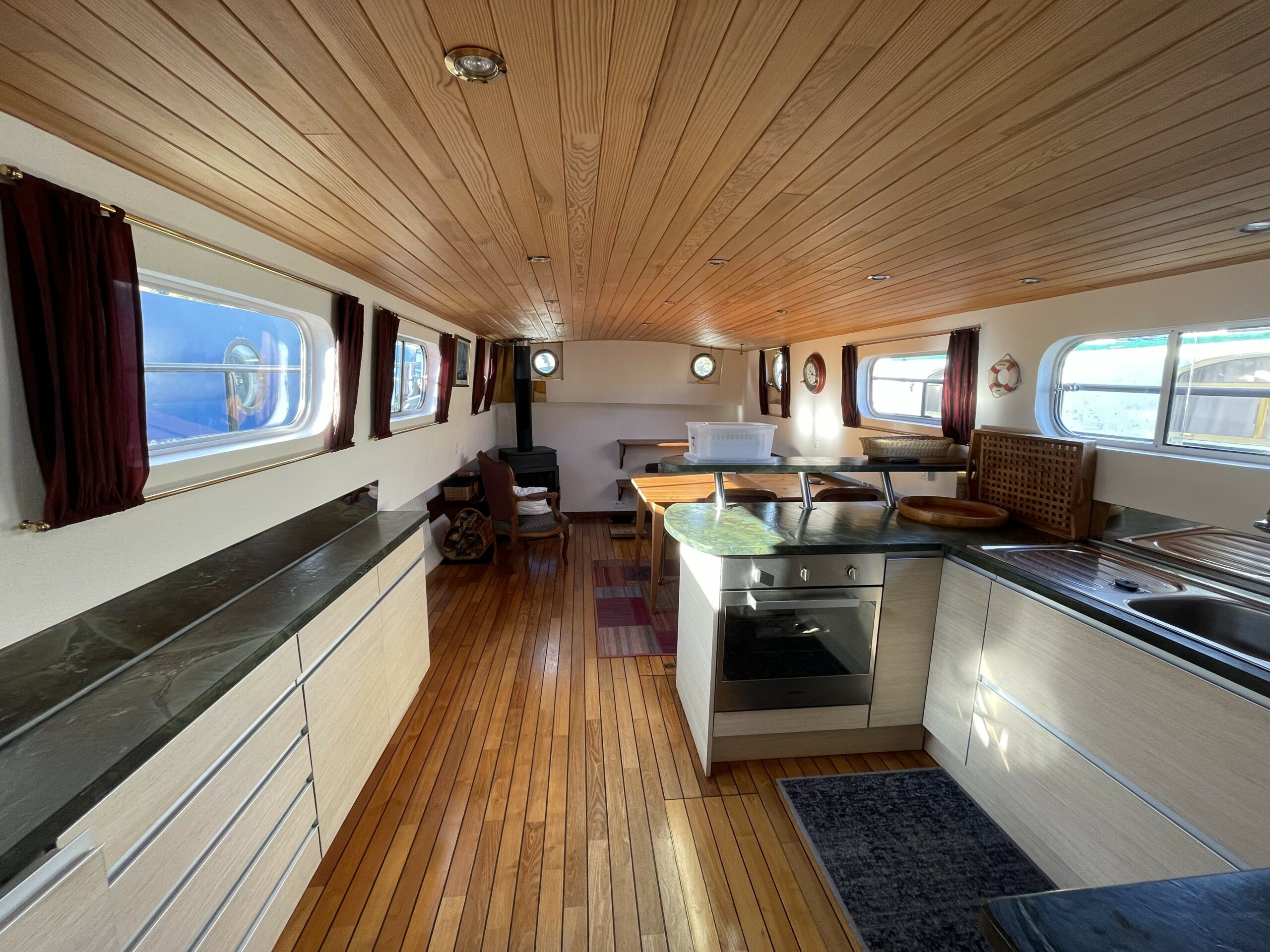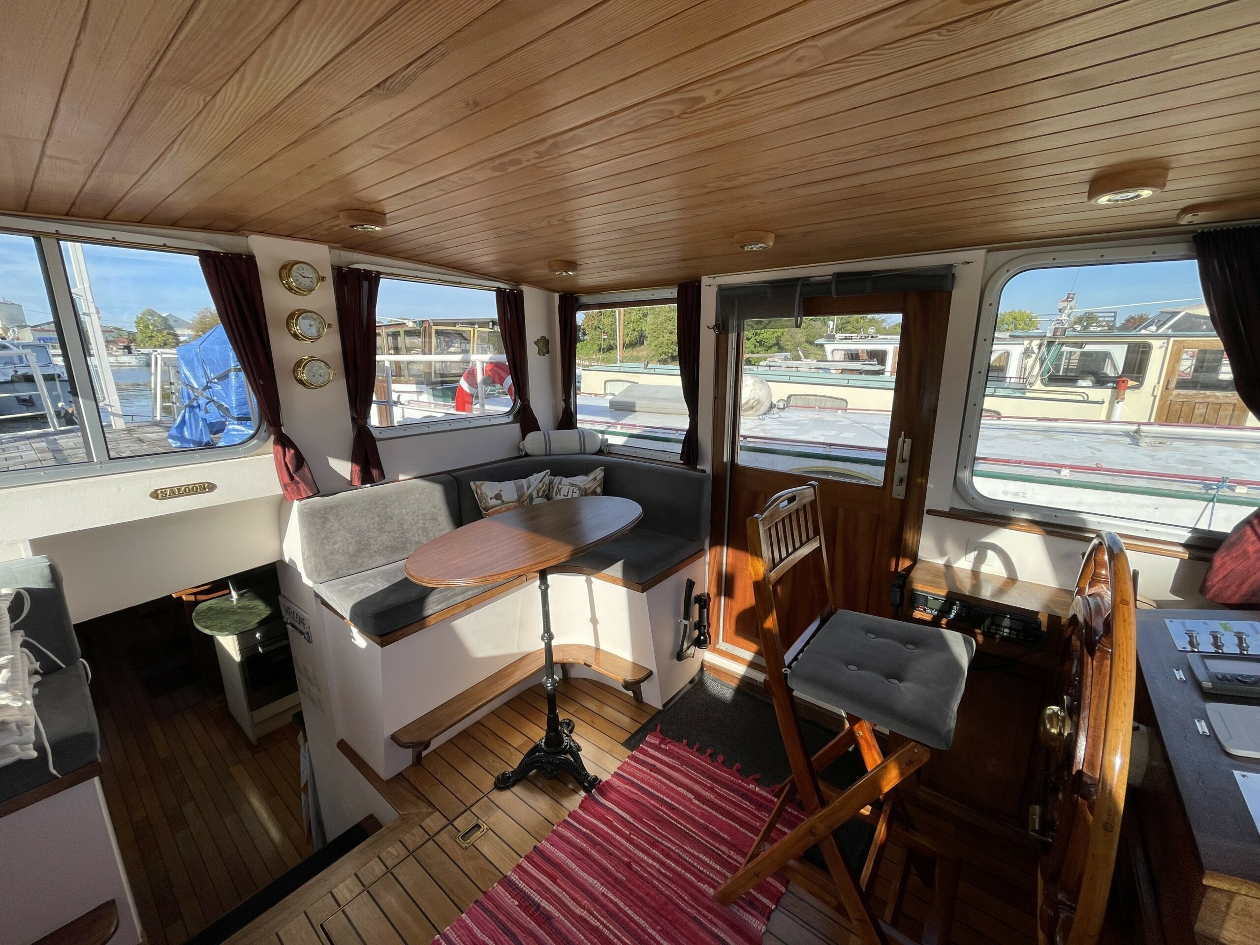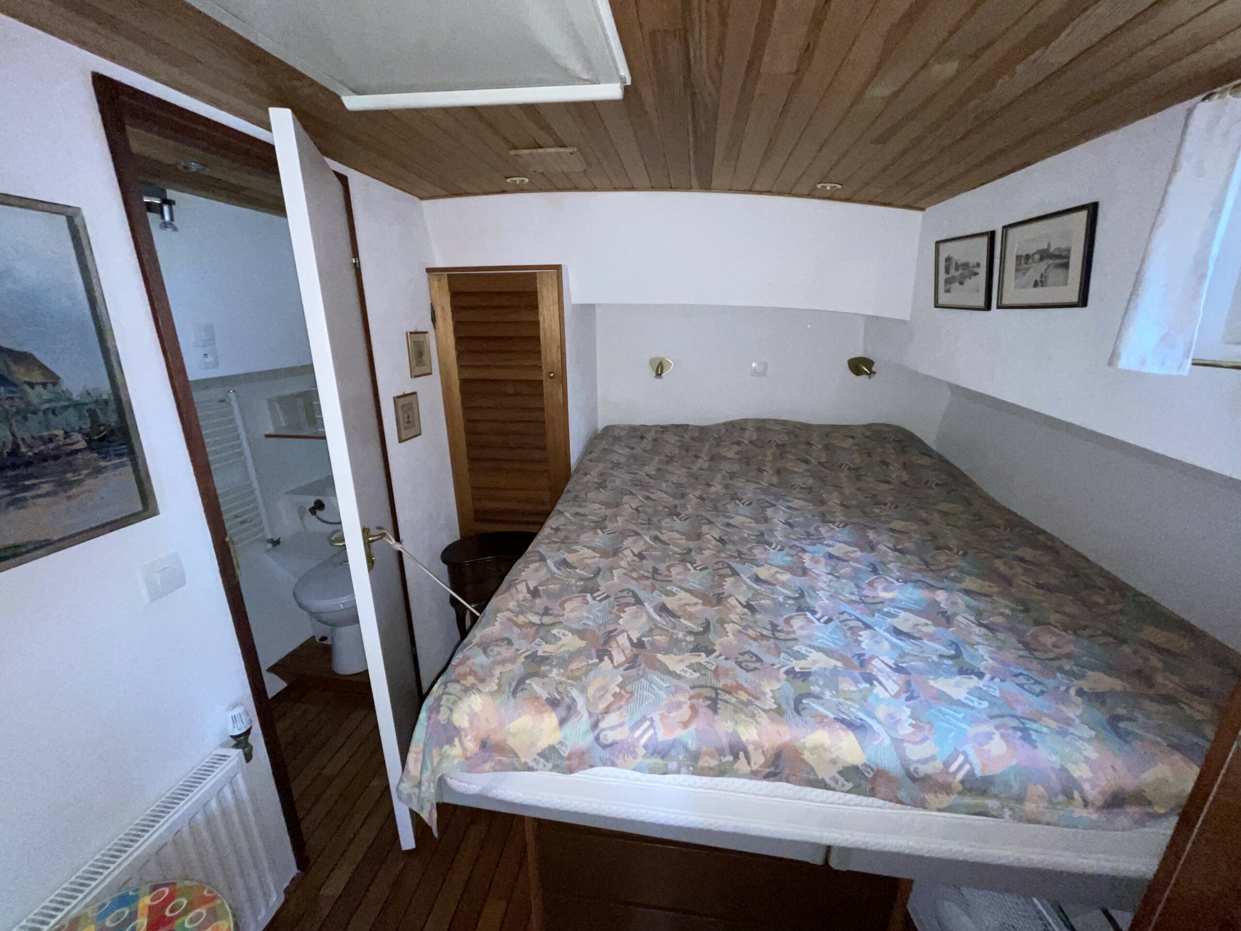 Dieser wunderschöne, 19 Meter lange Tjalk aus dem Jahr 1910 besticht durch seine Authentizität und seine großzügigen Abmessungen. Er verfügt über eine große, mit einer Sonnenplane überdachte Terrasse sowie ein Steuerhaus mit zwei Seitentüren. Im Inneren befinden sich ein geräumiger Salon mit Einbauküche und zwei Doppelkabinen im Bug, die jeweils über ein separates WC und eine Dusche verfügen. Zahlreiche Stauräume optimieren den Wohnraum.