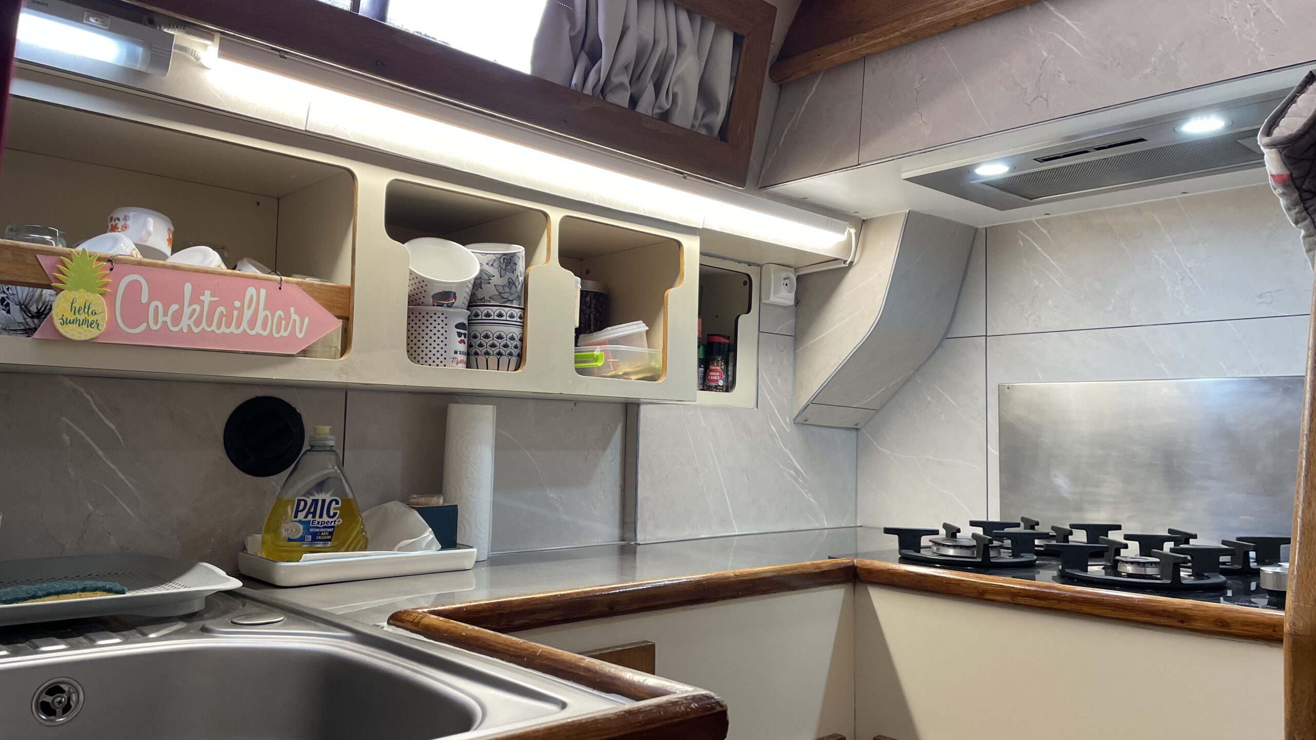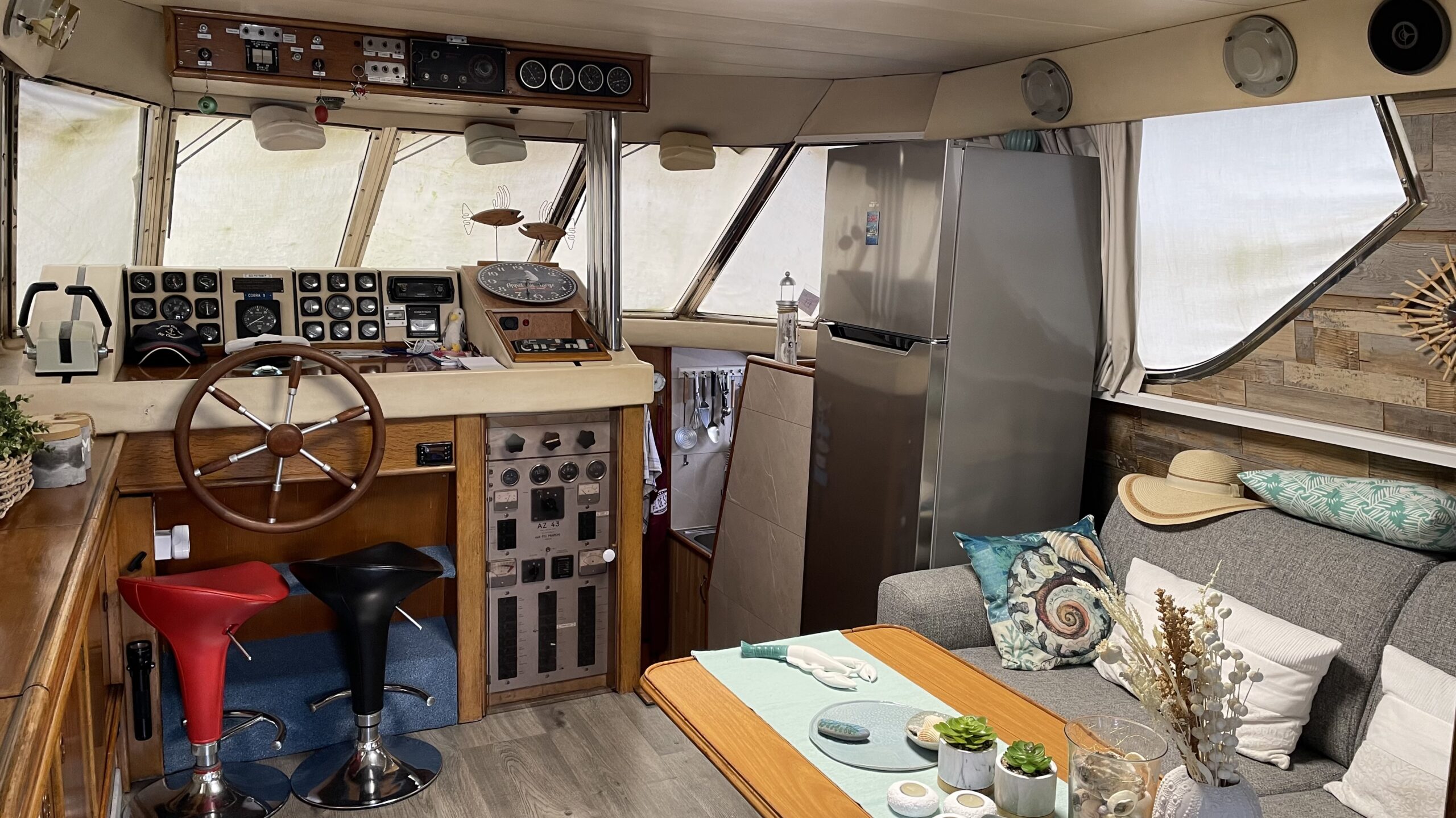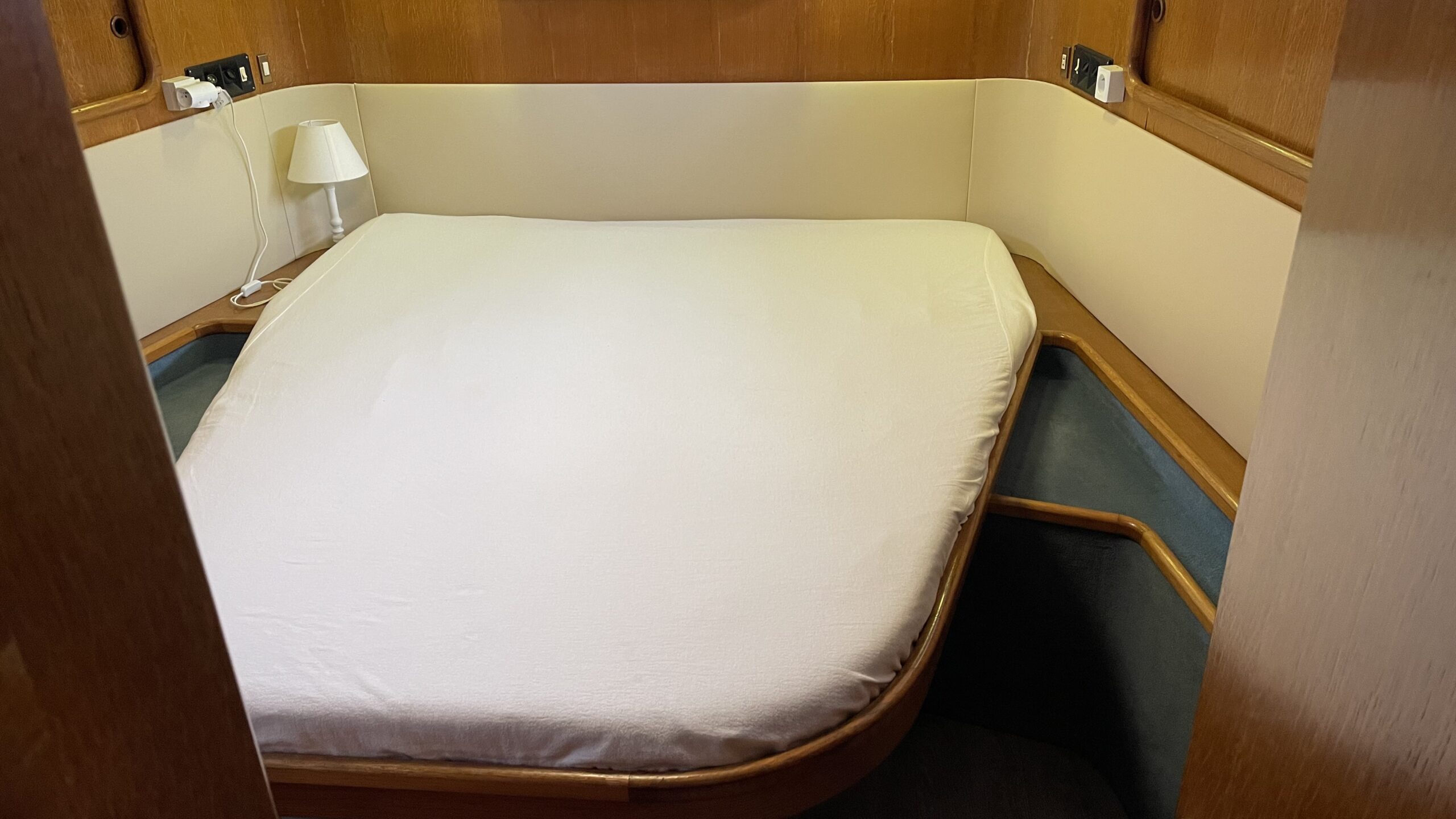 Das Interieur bietet einen geräumigen und hellen Wohnbereich, ideal, um das Leben an Bord in vollen Zügen zu genießen. Es verfügt über zwei komfortable Kabinen, ein Badezimmer, eine voll ausgestattete Küche mit Gasherd, 200V-Kühlschrank, Gefrierschrank und Mikrowelle sowie über einen einladenden Salon, perfekt zum gemeinsamen Essen oder Entspannen.