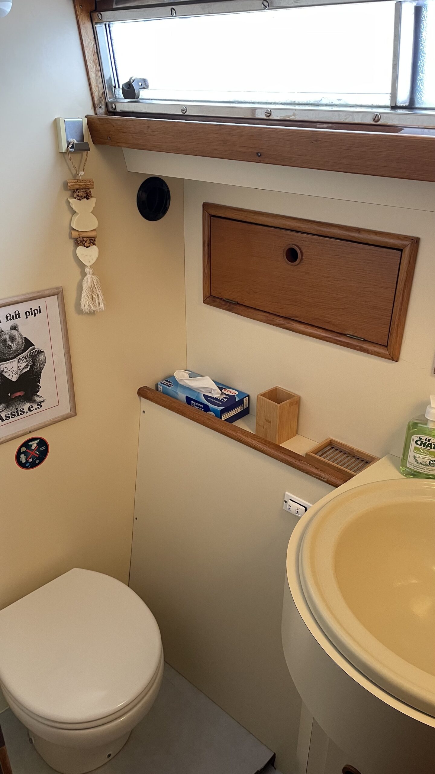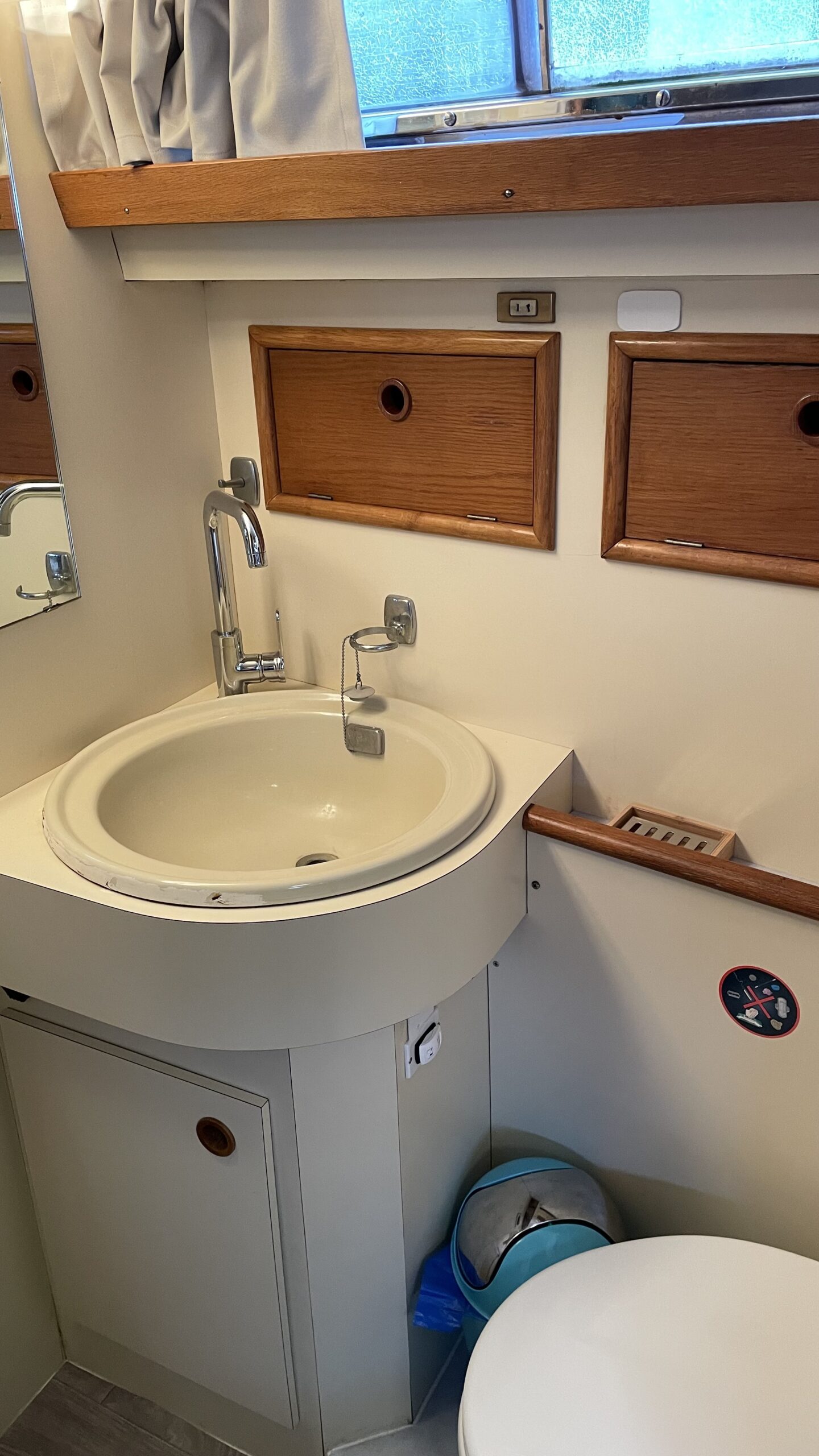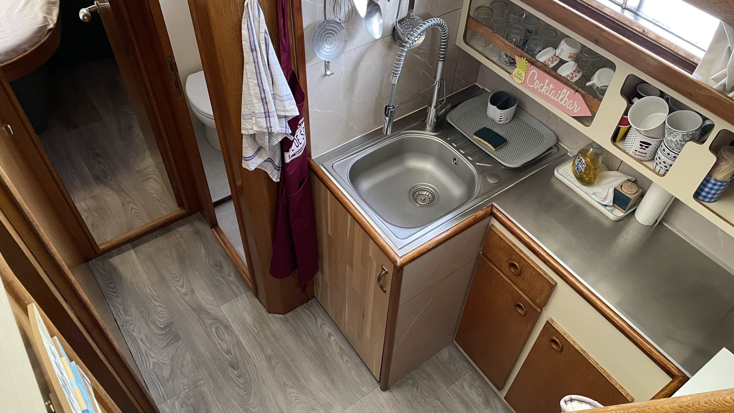 Das Interieur bietet einen geräumigen und hellen Wohnbereich, ideal, um das Leben an Bord in vollen Zügen zu genießen. Es verfügt über zwei komfortable Kabinen, ein Badezimmer, eine voll ausgestattete Küche mit Gasherd, 200V-Kühlschrank, Gefrierschrank und Mikrowelle sowie über einen einladenden Salon, perfekt zum gemeinsamen Essen oder Entspannen.