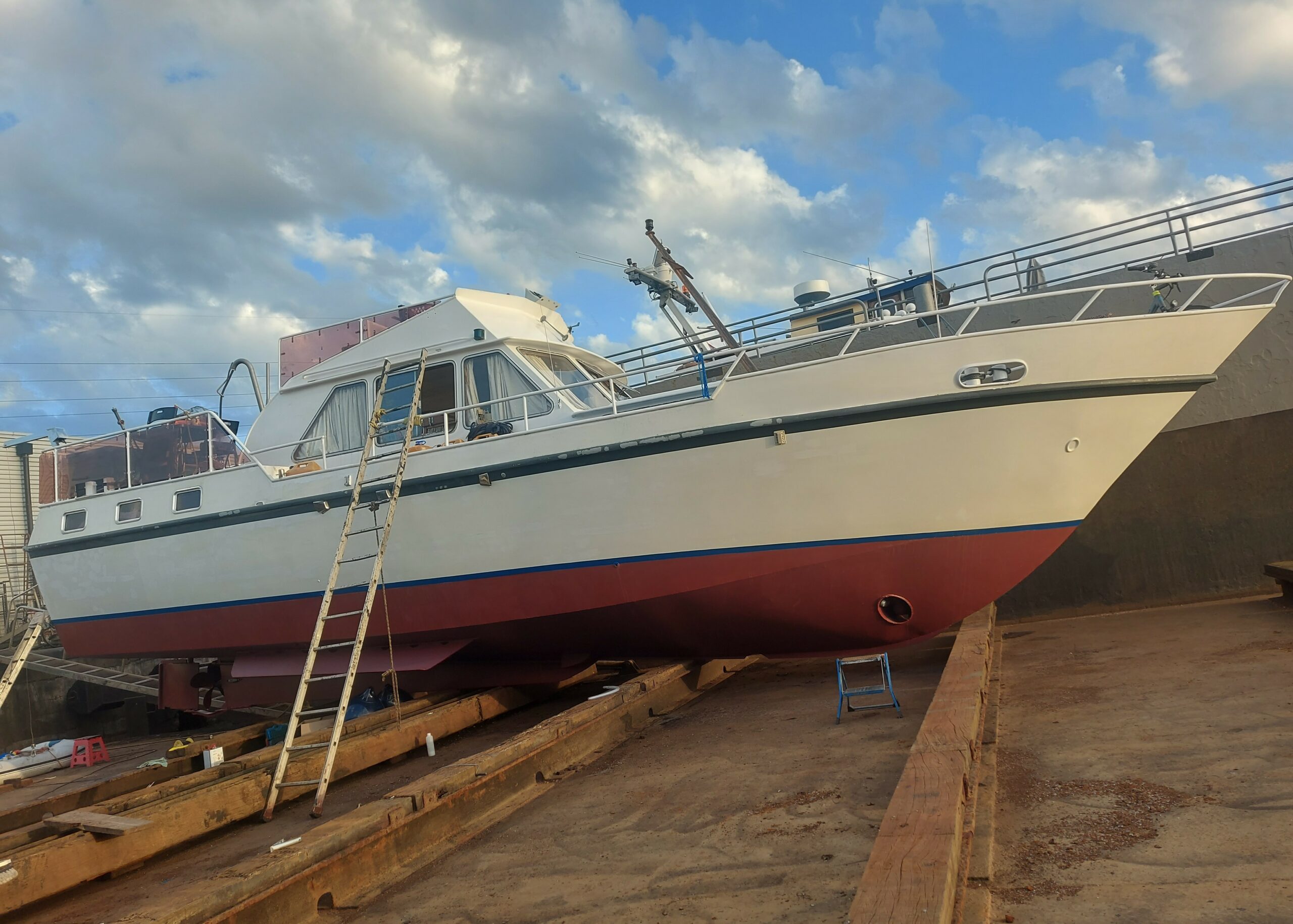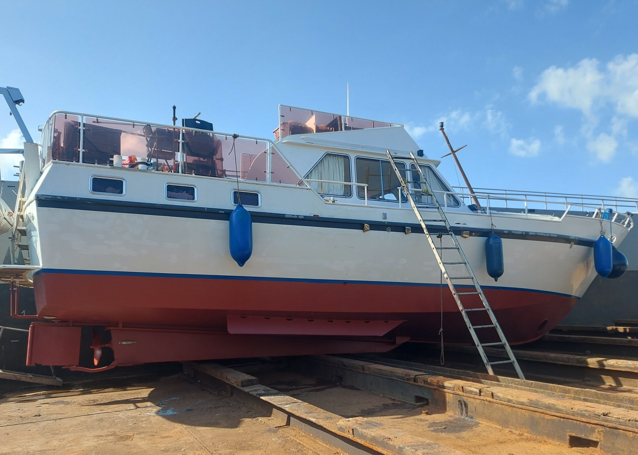 • Andererseits wurden im Sommer 2023 Rumpfbeschichtung und Lackierung durchgeführt: Abschleifen, Auftragen von zwei Grundanstrichen, gefolgt von zwei Schichten Brackwasser-Antifouling, konform mit den aktuellen Umweltstandards.