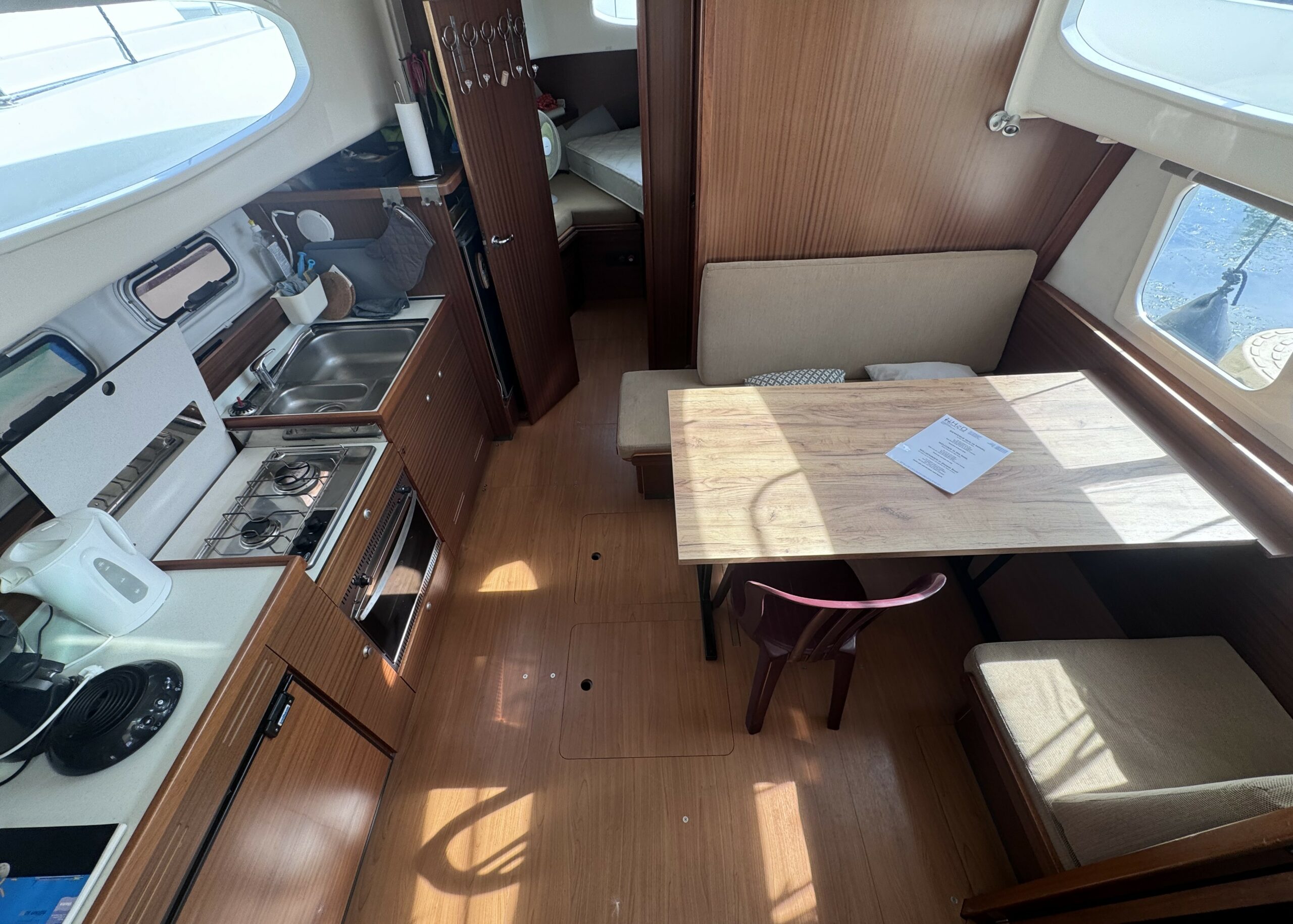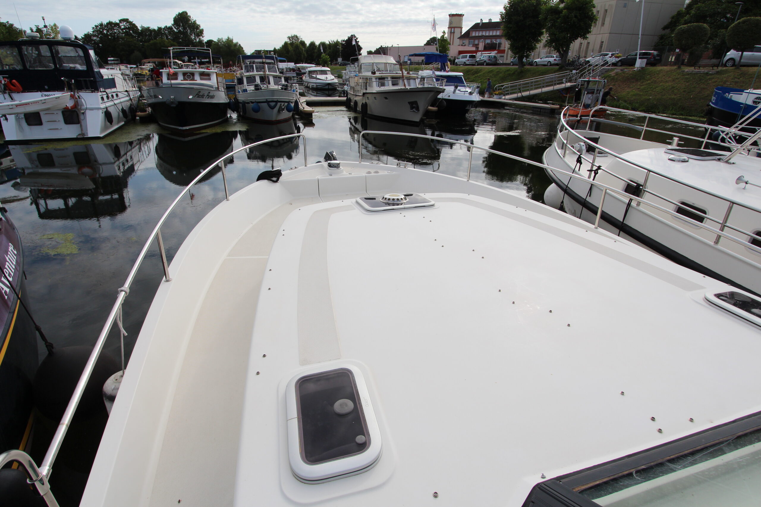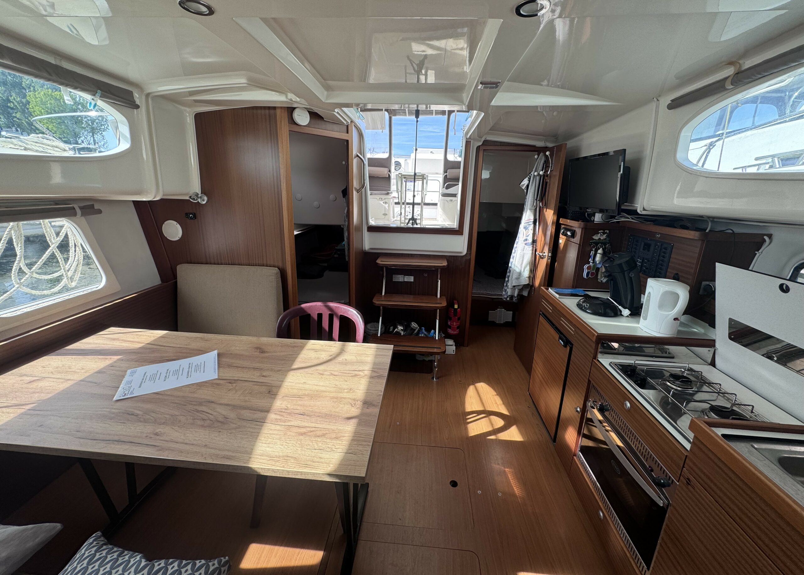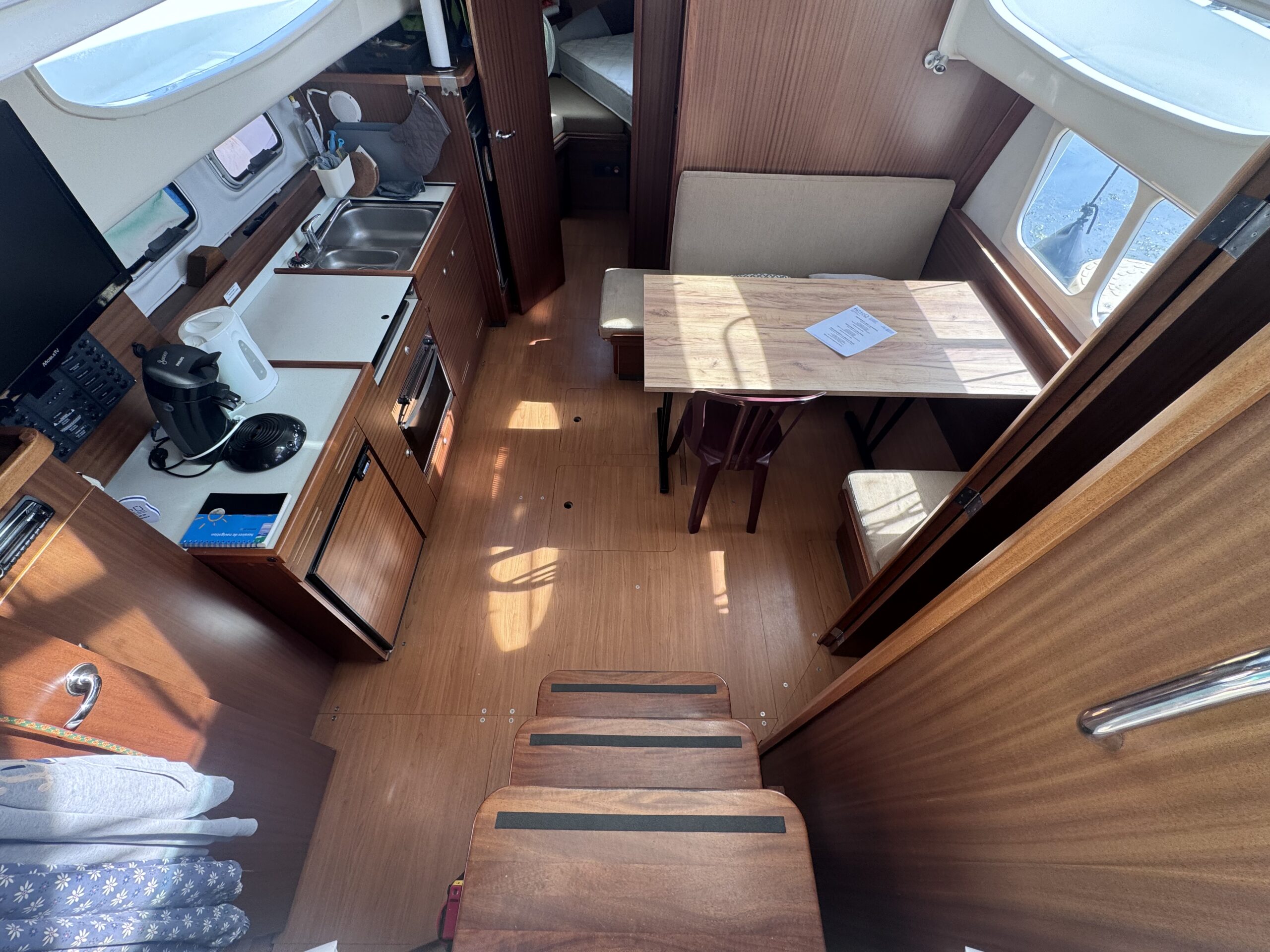 Mit einer Länge von 10,50 Metern und einer Breite von 3,45 Metern bietet sie einen geräumigen und hellen Innenraum, der perfekt auf das Leben an Bord ausgelegt ist. Die Aufteilung umfasst drei Kabinen, die Platz für bis zu 6 Personen bieten. Eine voll ausgestattete Küche sowie ein Badezimmer mit WC runden dieses funktionale und gemütliche Gesamtpaket ab.