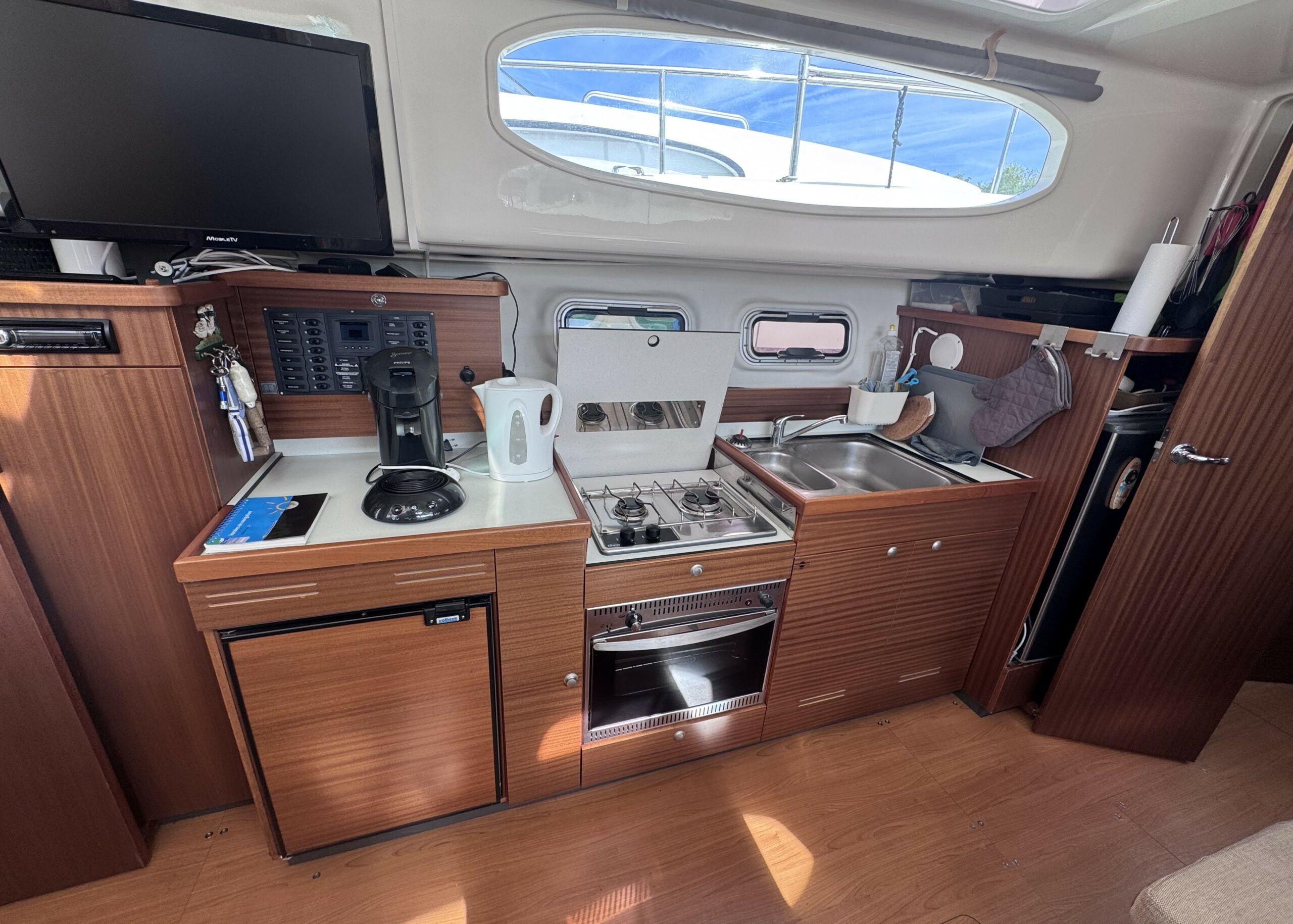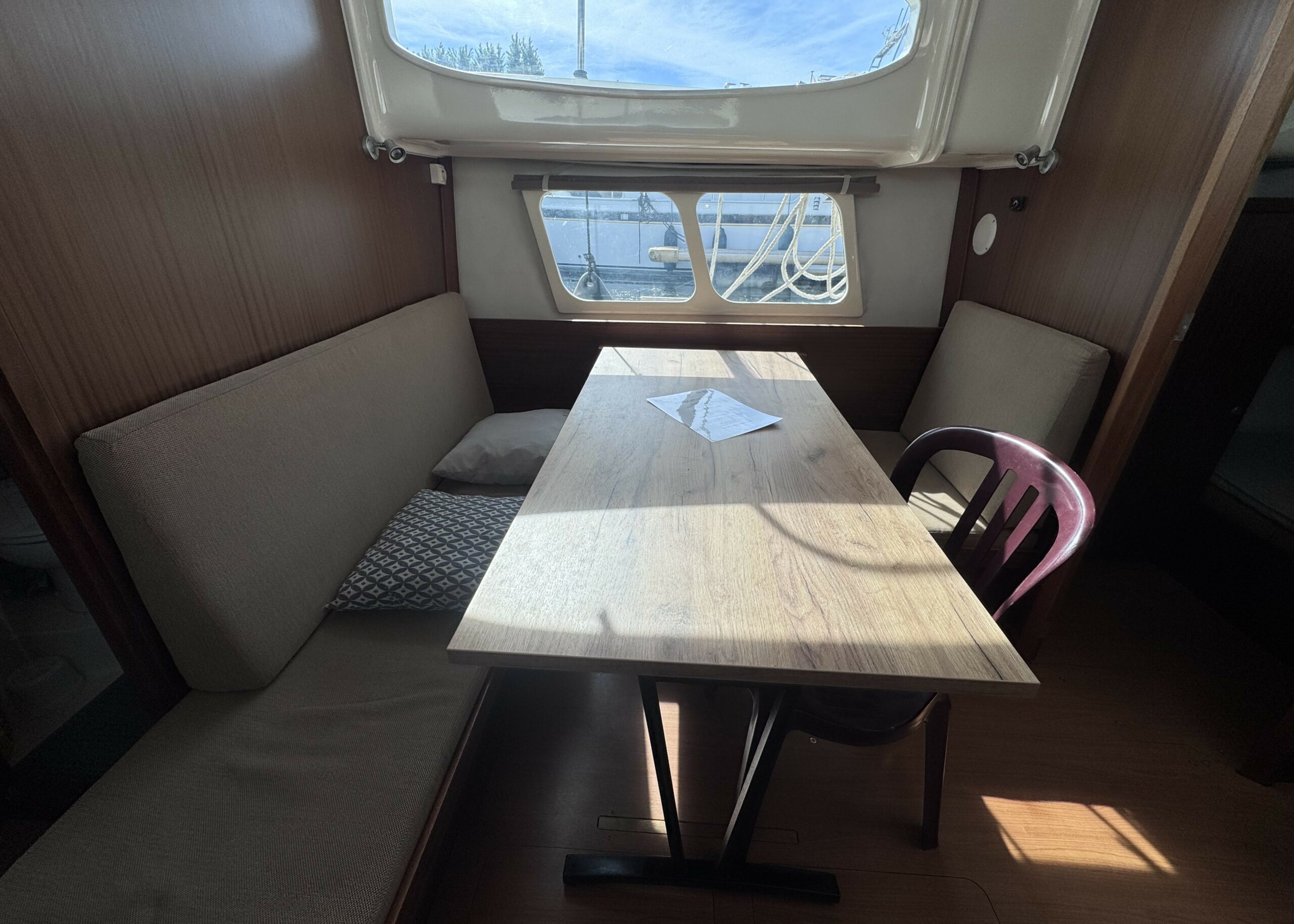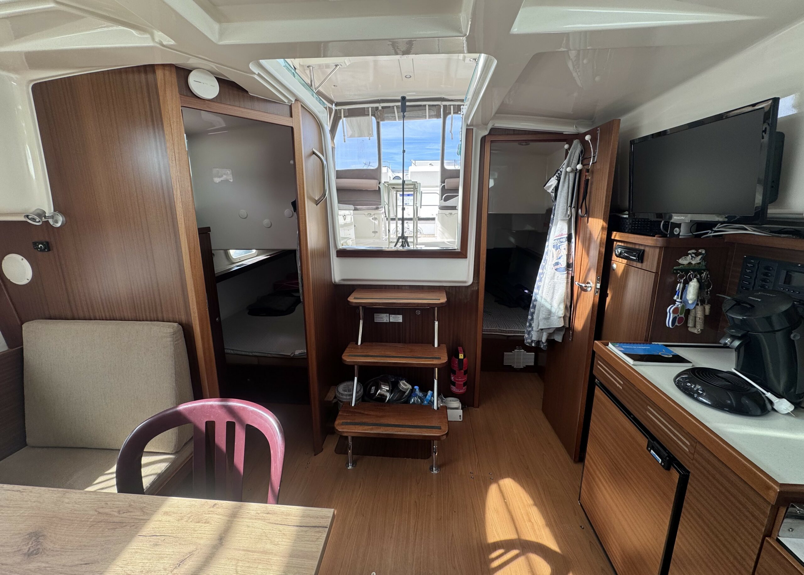 Mit einer Länge von 10,50 Metern und einer Breite von 3,45 Metern bietet sie einen geräumigen und hellen Innenraum, der perfekt auf das Leben an Bord ausgelegt ist. Die Aufteilung umfasst drei Kabinen, die Platz für bis zu 6 Personen bieten. Eine voll ausgestattete Küche sowie ein Badezimmer mit WC runden dieses funktionale und gemütliche Gesamtpaket ab.