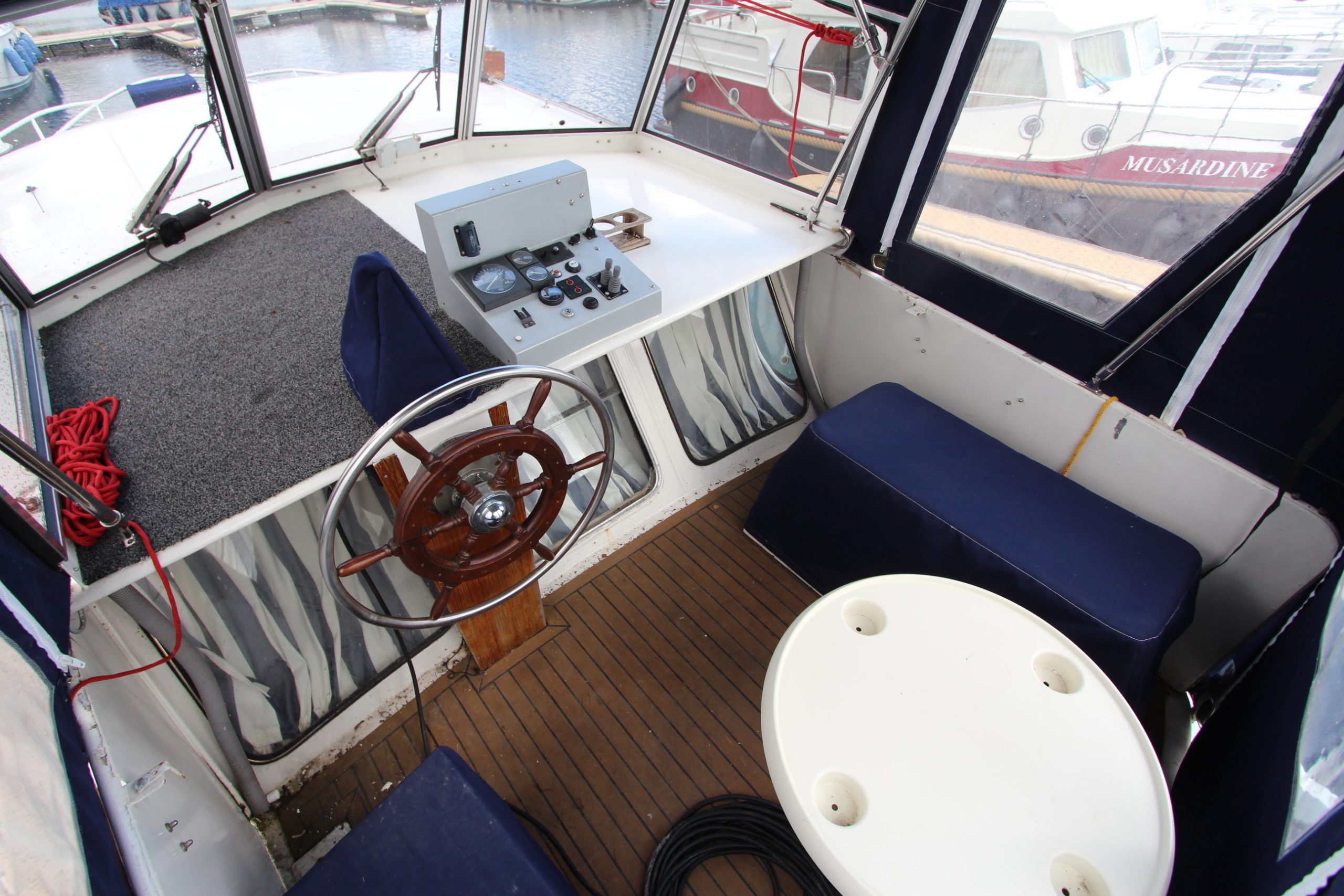 Küsten- und Flussboot aus dem Jahr 1980. Helles und komfortables Interieur. Terrasse mit Steuerstand. Zwei seitliche Eingänge. Salon mit Sitzbänken und Innensteuerstand. Achterkabine mit 2 Einzelbetten und Waschbecken. WC. Dinette, die in ein Doppelbett umgewandelt werden kann, und Küche. Vorderes Doppelbett. Geräumiger Innenraum, bestehend aus zahlreichen Staufächern.