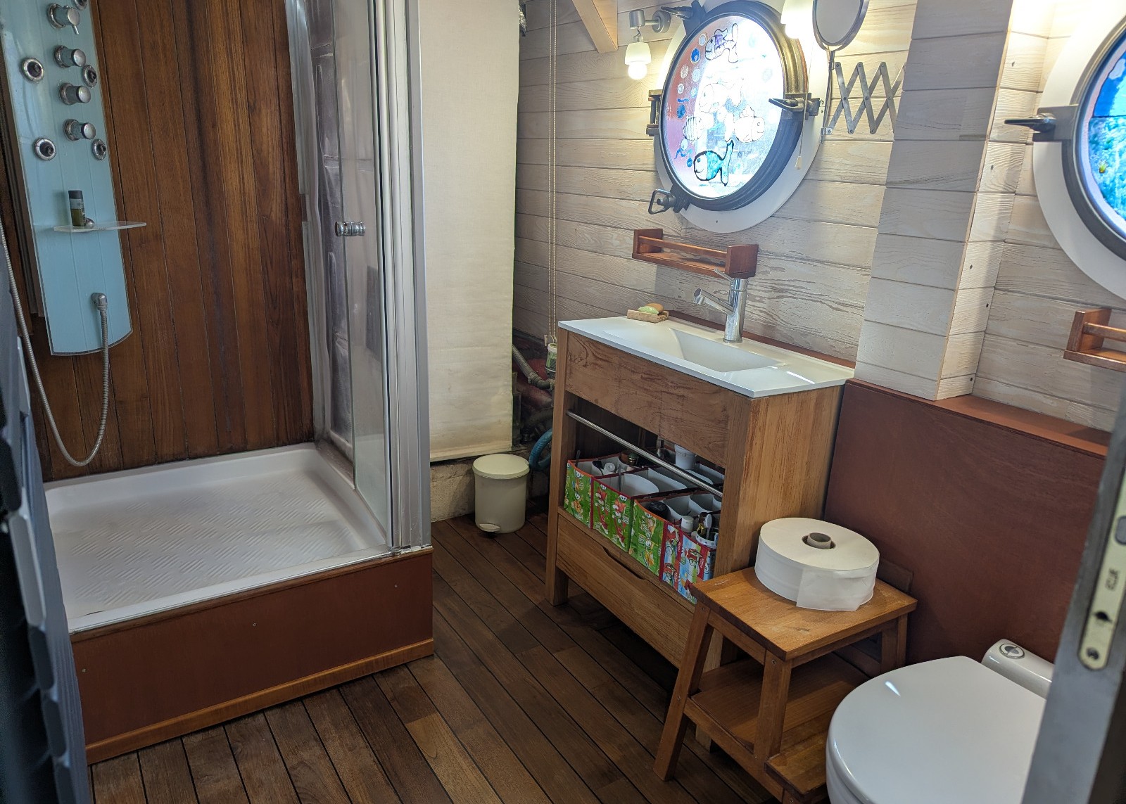 Im Inneren bietet die Einrichtung ein gemütliches und komfortables Wohnambiente. Das Hausboot verfügt über vier Kabinen, die sich ideal für die Unterbringung von Familie und Gästen eignen; jede davon ist so konzipiert, dass der Platz optimal genutzt wird, ohne dabei die intime Atmosphäre zu beeinträchtigen. Der besonders angenehme Salon besticht durch seine Geräumigkeit und Helligkeit und bietet einen echten Lebensraum, der sowohl zur Entspannung als auch zur Geselligkeit einlädt.