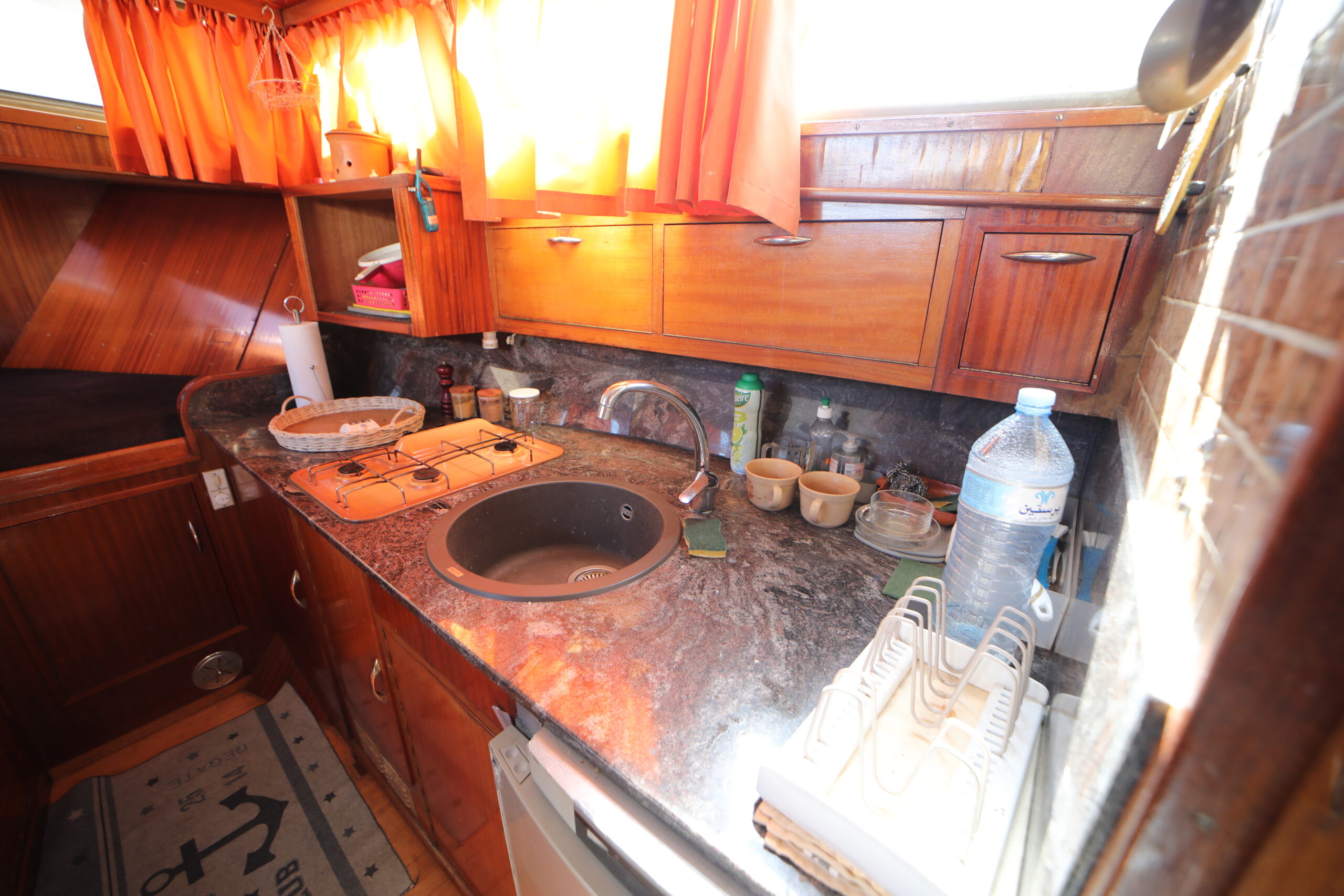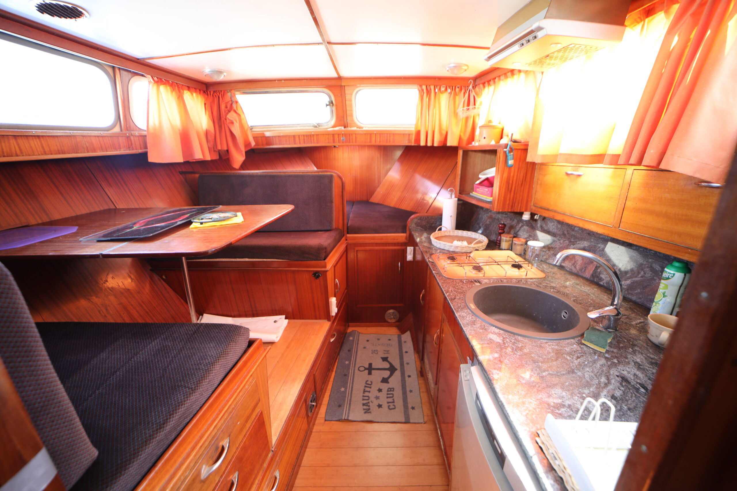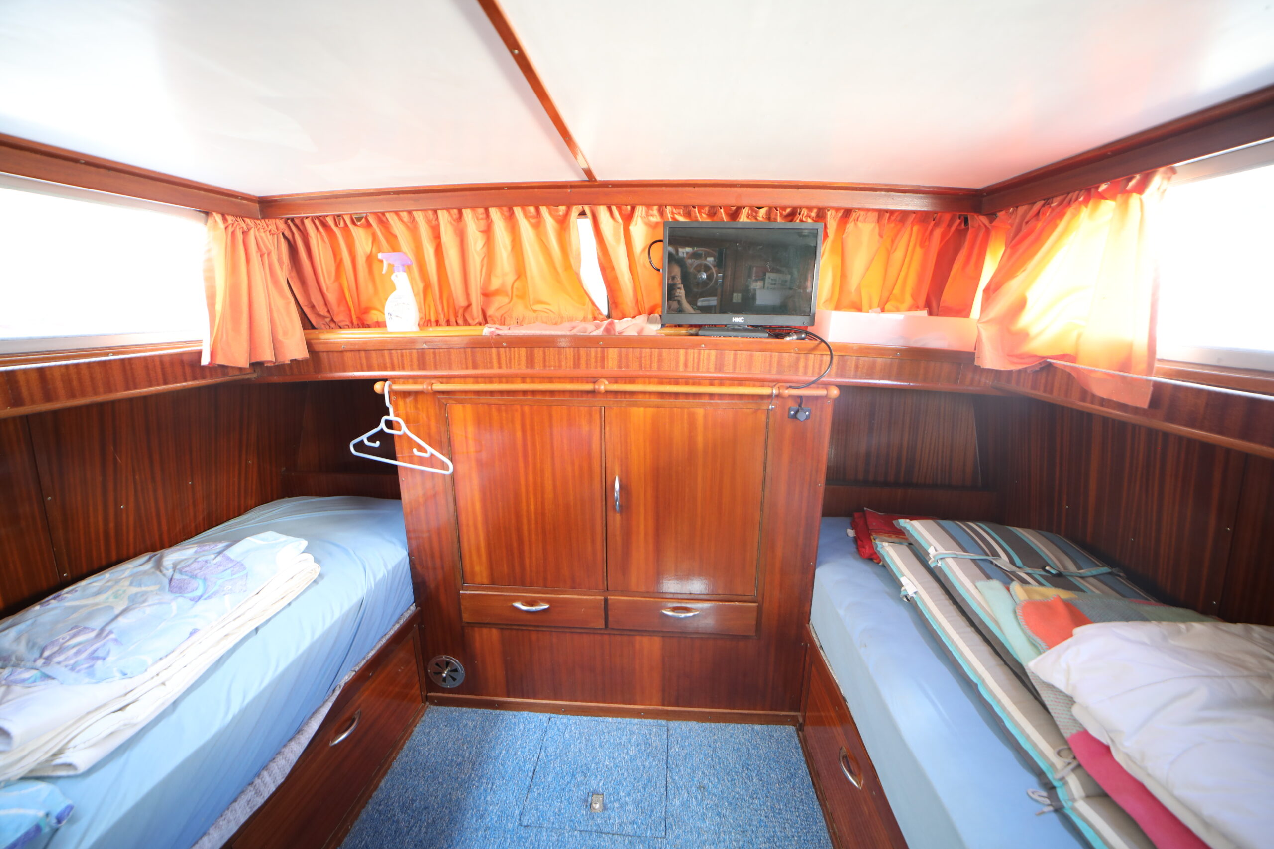Im Inneren sorgt die hochwertige Holzverarbeitung für eine warme und authentische Atmosphäre. Die Yacht bietet 6 Schlafplätze: eine Achterkabine mit zwei Einzelbetten sowie ein zum Doppelbett umwandelbarer Salon. Ergänzt wird der Schlafbereich durch ein funktionales Badezimmer mit Waschbecken und WC.