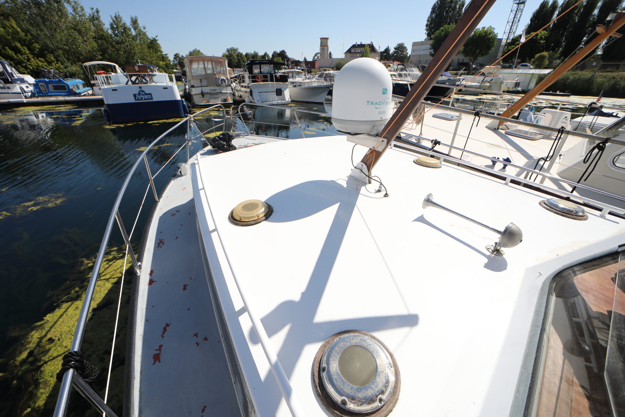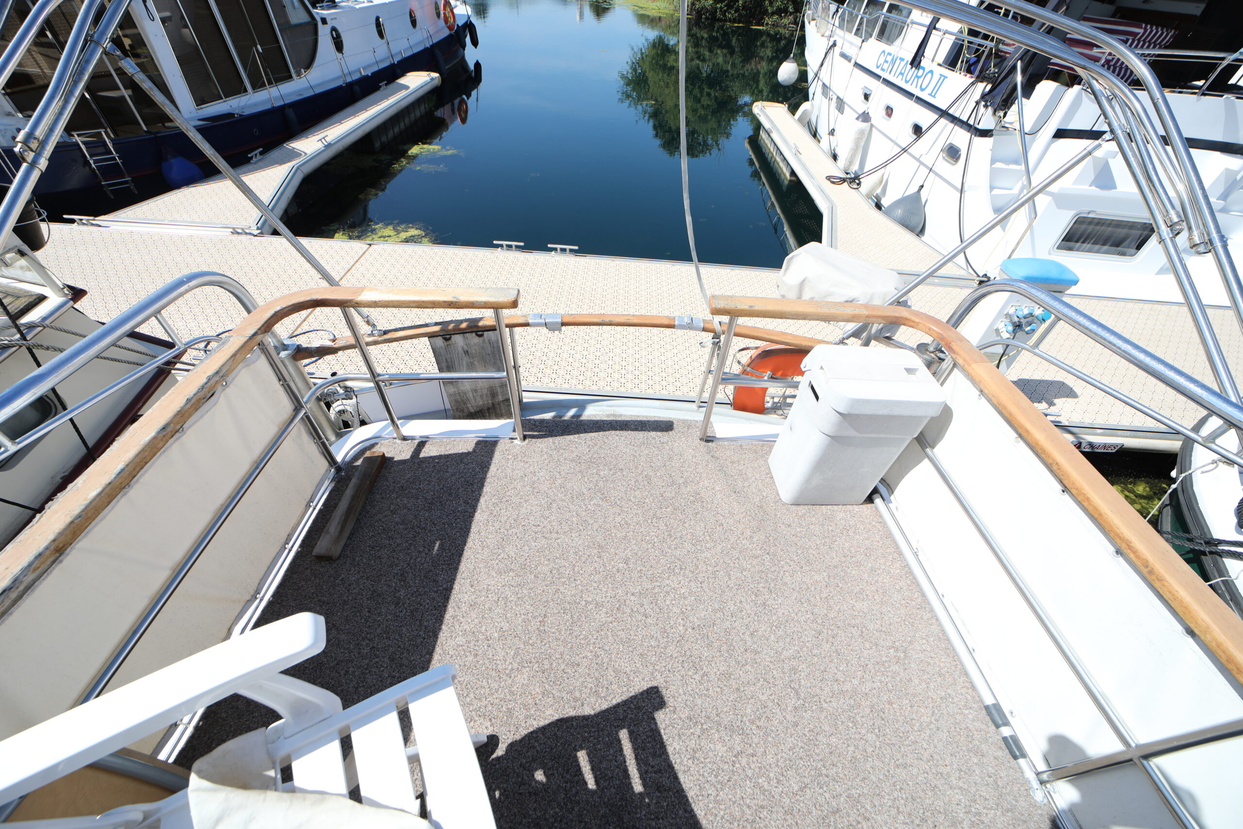 Für die Navigation verfügt die Yacht über zwei Steuerstände – innen und außen – und ist somit bei jedem Wetter flexibel einsetzbar. Das Teakdeck, in hervorragendem Zustand, bietet großzügige Flächen im Bug- und Heckbereich, ideal zum Entspannen oder zum Empfang von Gästen. Der Heckbereich ist durch ein großes Bimini geschützt.