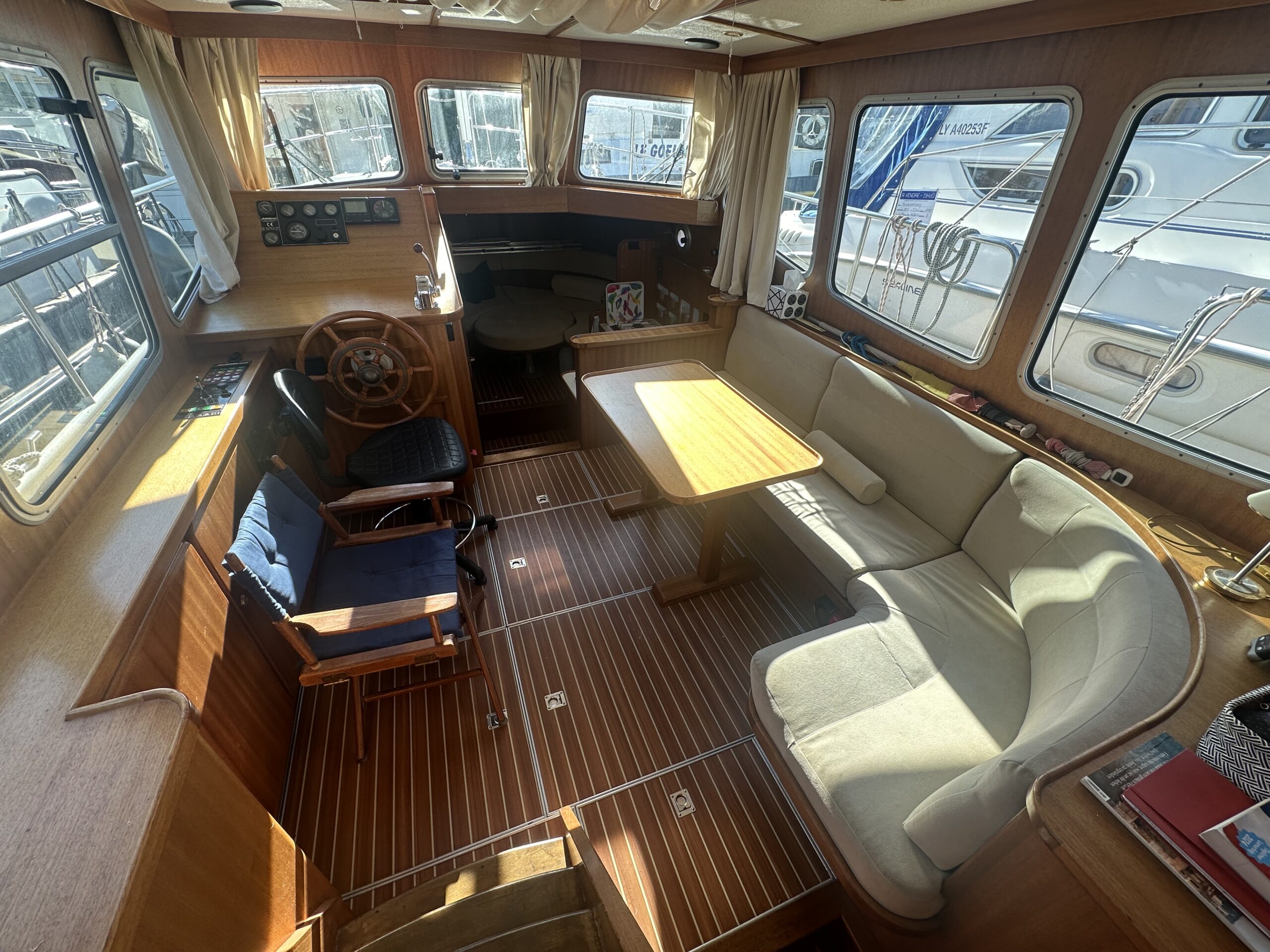 Der helle Salon mit L-förmigem Sofa und Innensteuerstand schafft eine gemütliche Wohnatmosphäre mit schönem Ausblick nach draußen.