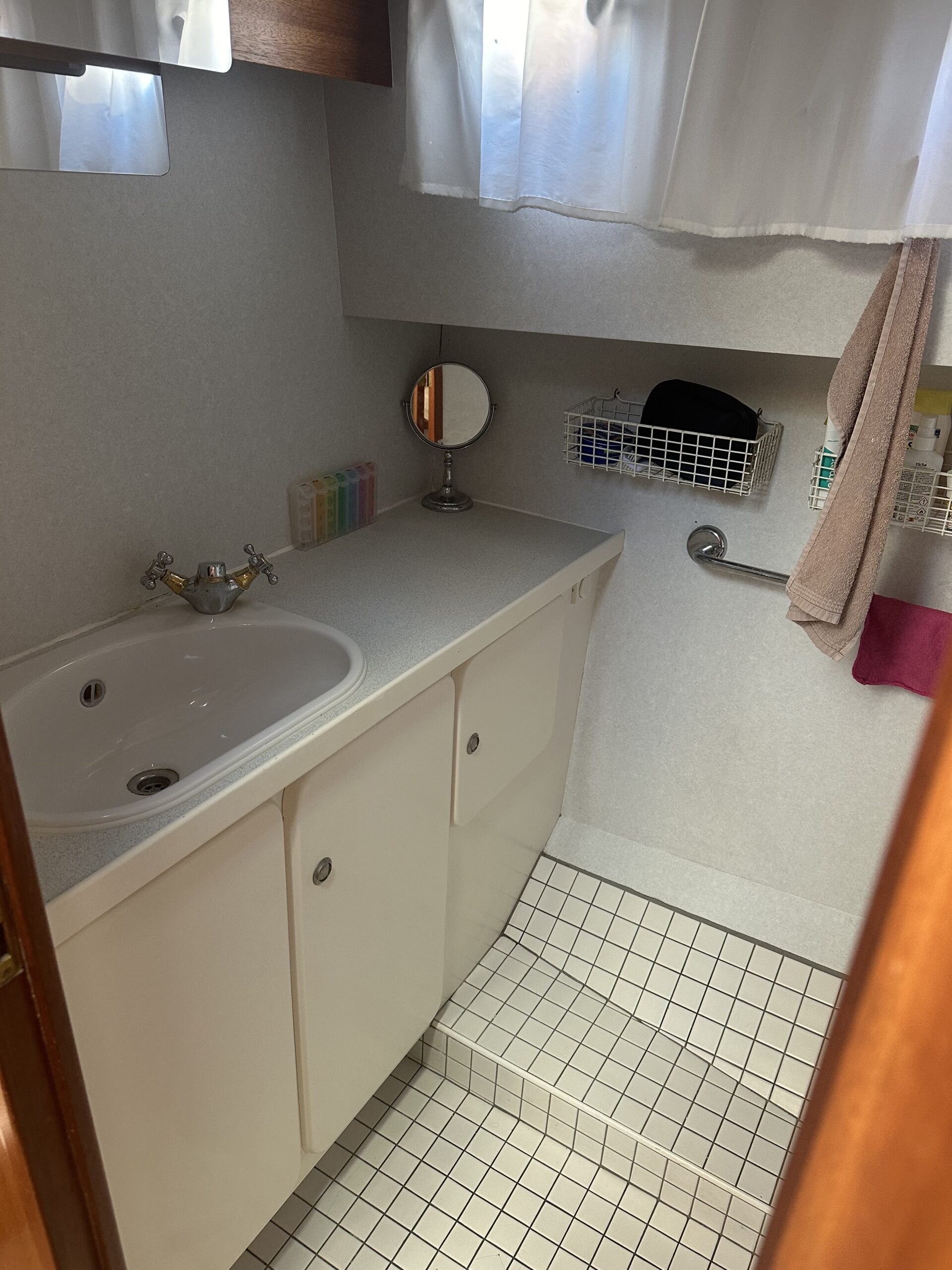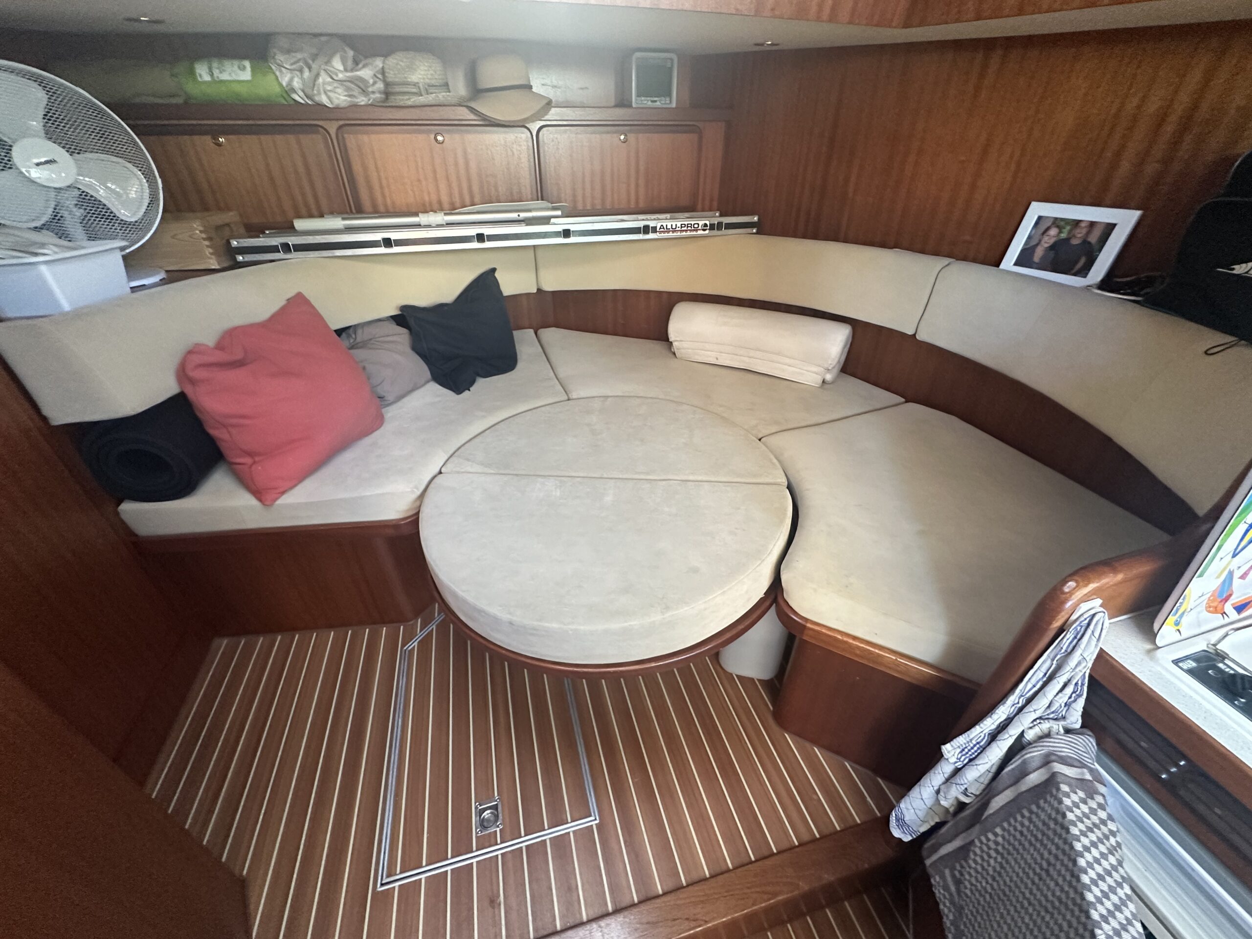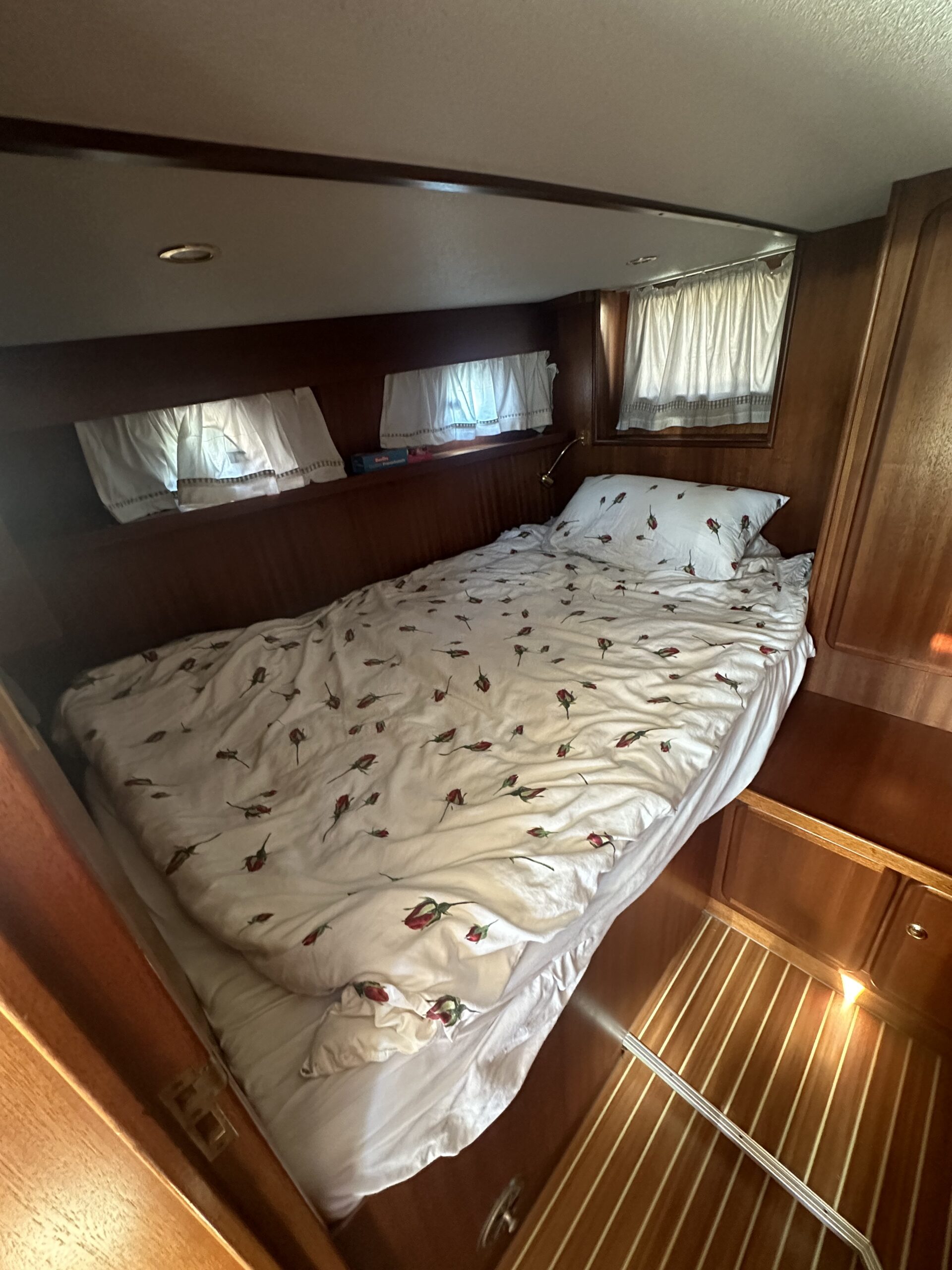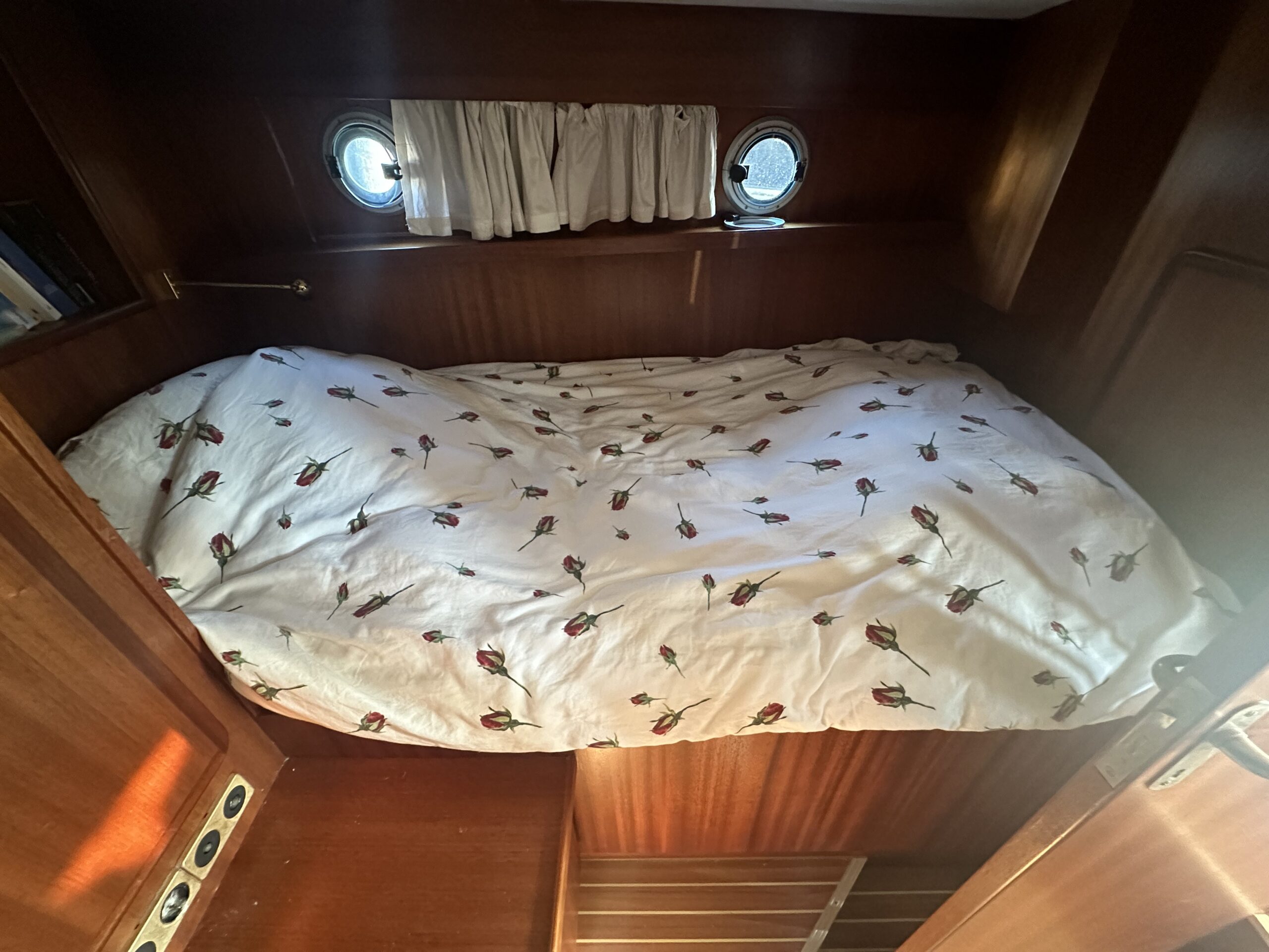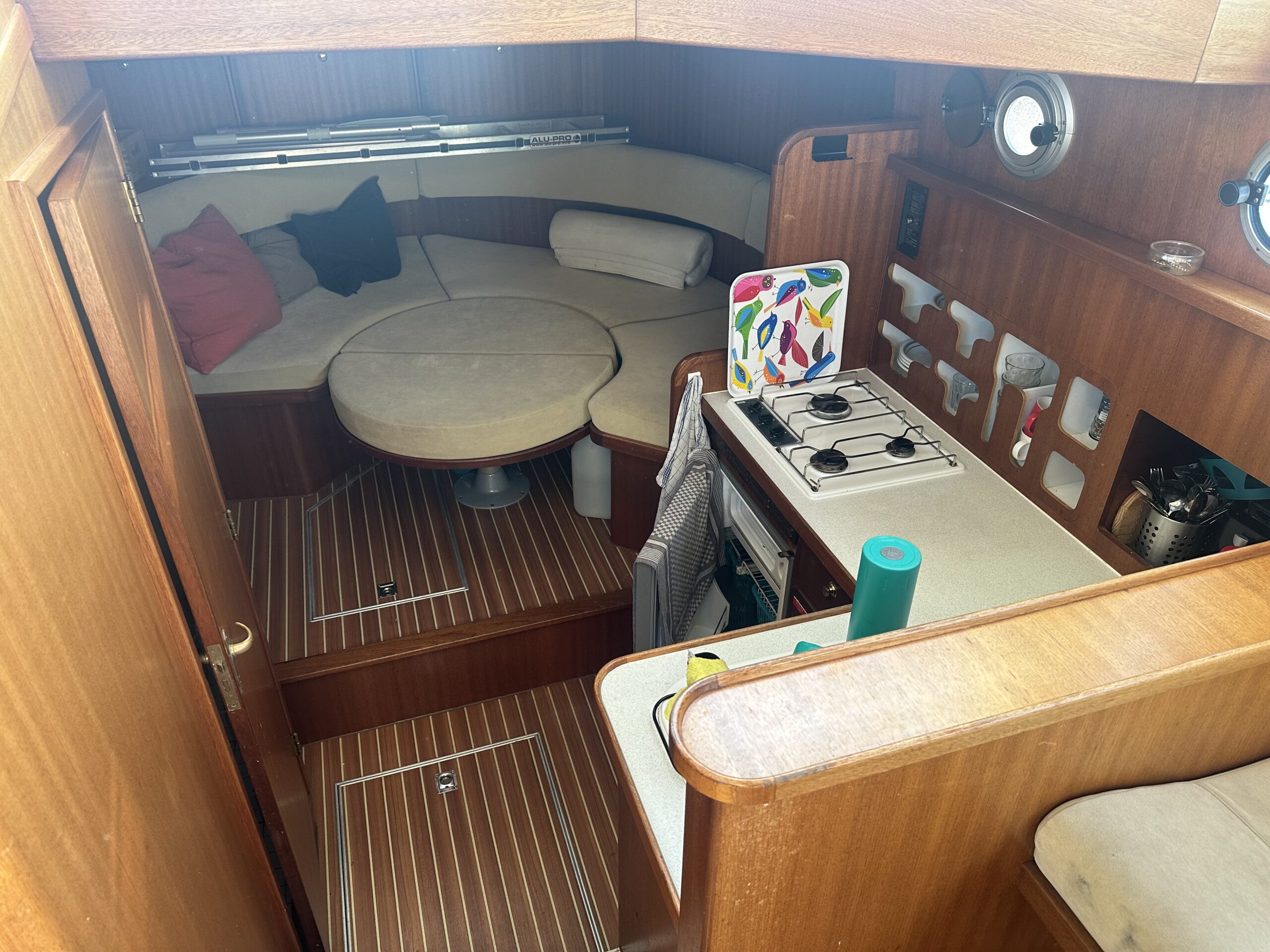 Innen bietet das Boot eine ideale Raumaufteilung für Reisen zu zweit oder mit der Familie. Es verfügt über drei Schlafplätze: eine Achterkabine mit zwei Einzelbetten und Stauraum sowie eine umwandelbare Dinette.