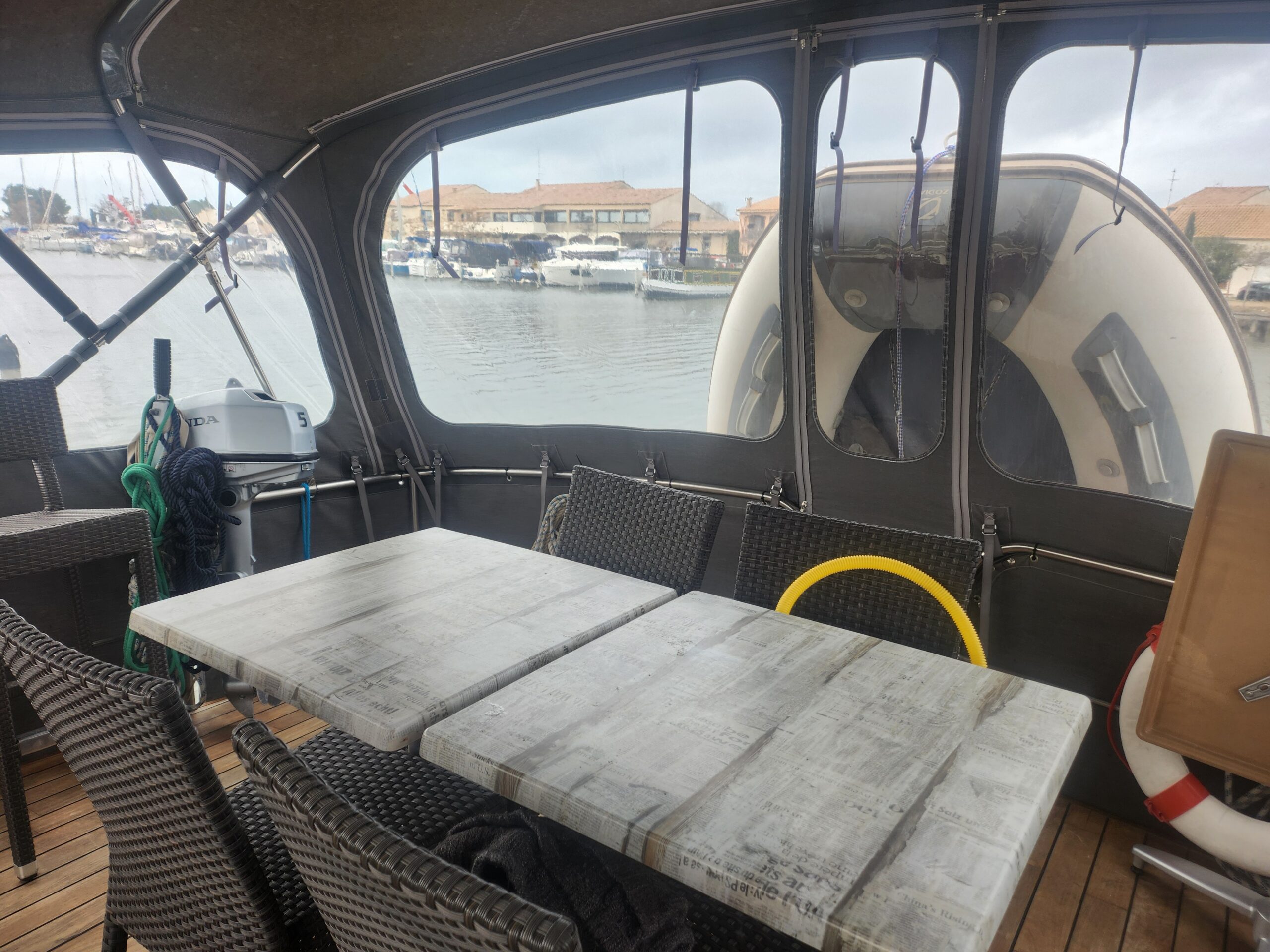 Im Außenbereich bietet die hintere Terrasse einen großzügigen Entspannungsbereich, ideal, um die Fahrt oder Zwischenstopps in vollen Zügen zu genießen. Der geräumige und gut geschützte Steuerstand sorgt für ein angenehmes, sicheres und komfortables Fahrverhalten, auch auf langen Strecken.