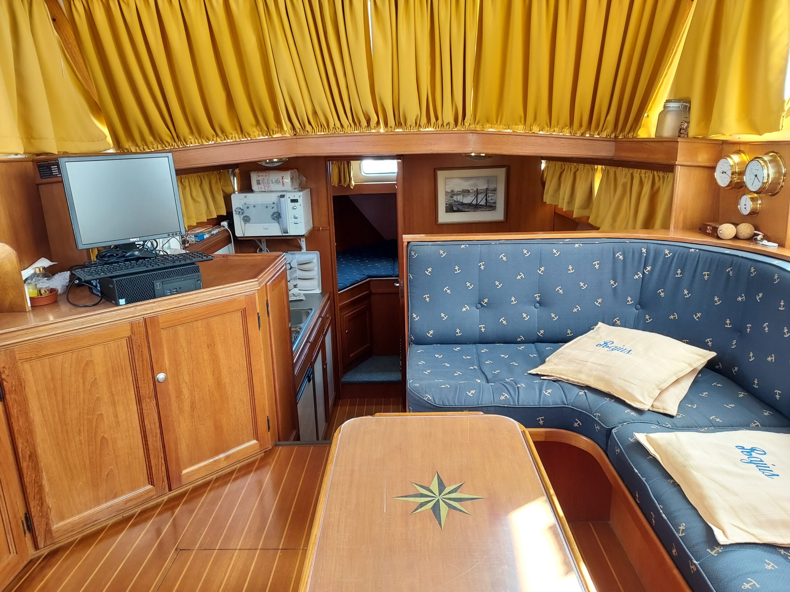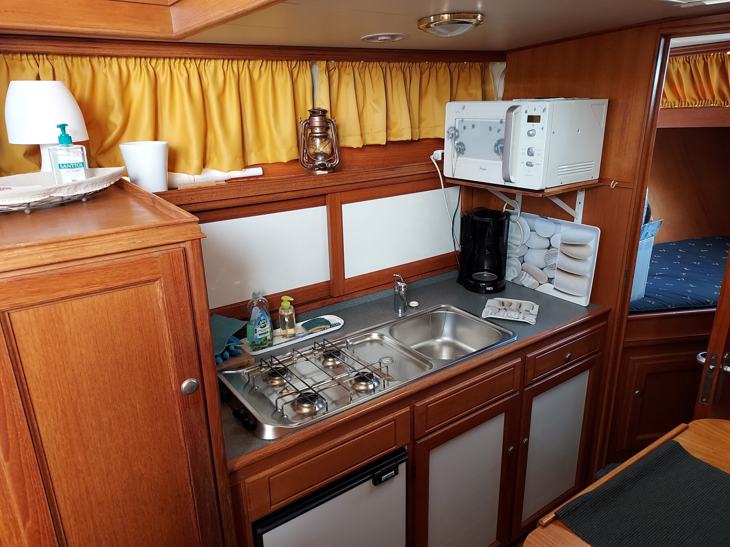 Zunächst beeindruckt das helle Interieur mit seinen schönen Holzausführungen durch eine warme und einladende Atmosphäre. Das Boot verfügt über zwei geschlossene Kabinen, einen geräumigen Salon und eine voll ausgestattete Küche (Gasherd, 12V-Kühlschrank, Mikrowelle). Darüber hinaus sorgt ein Bad mit Dusche und WC für eine funktionale Ausstattung und gewährleistet echte Autonomie an Bord.