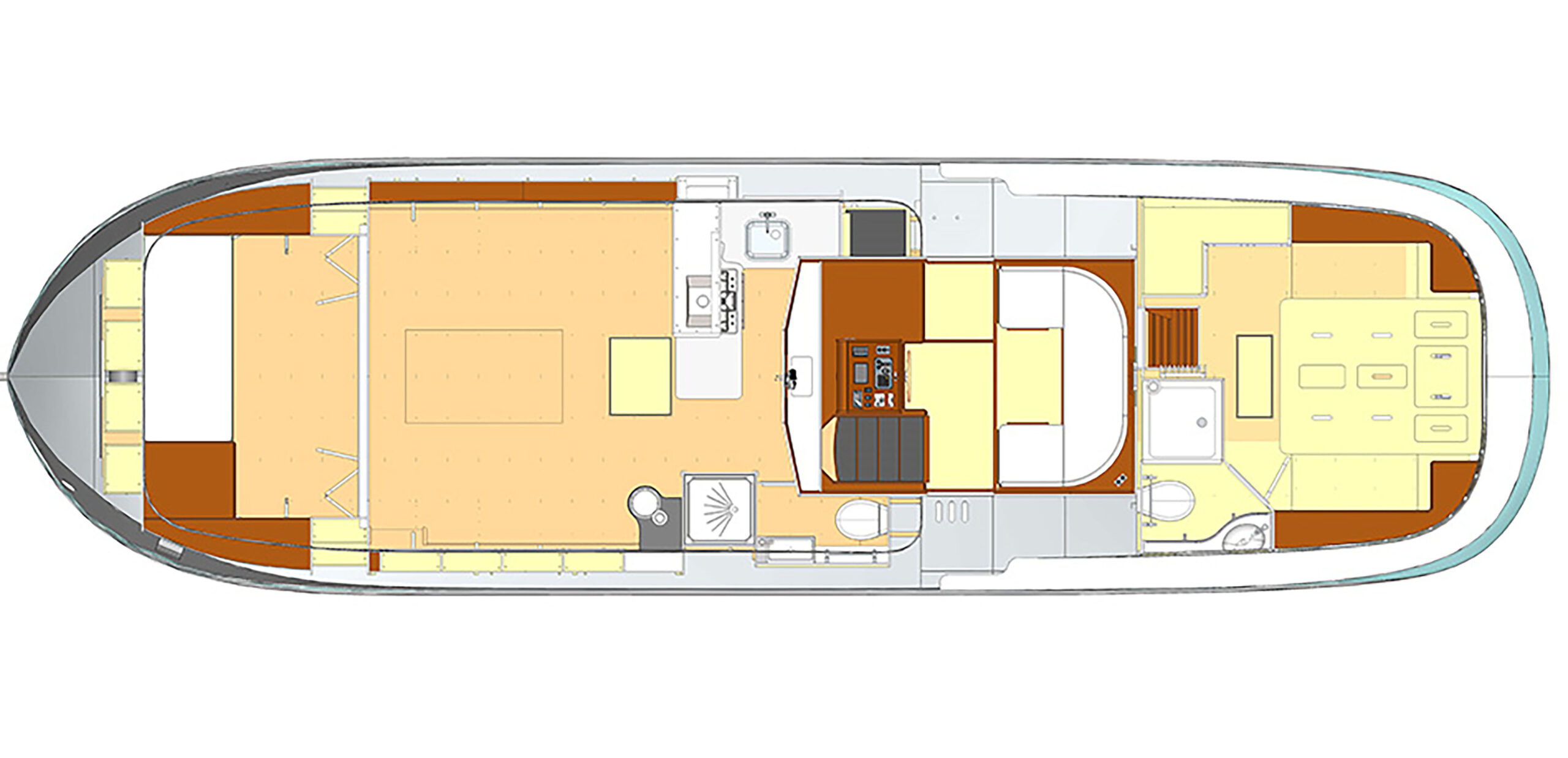 Die Eignerkabine im Heck bietet ein zentrales Doppelbett, viel Stauraum und direkten Zugang zum Badezimmer mit separater Dusche, Waschbecken und elektrischer Toilette. Die umbaubare Vorderkabine bietet eine perfekt ausgestattete Doppelgästekabine. Ein Gästebad mit separater Dusche, Waschbecken und elektrischer Toilette vervollständigt den Gästebereich. Das Steuerhaus, das mit seinen Lamellenjalousien ebenfalls sehr elegant ist, lässt sich in ein Doppelbett umwandeln. Die leistungsstarke Isolierung, die Zentralheizung, der Ofen und die Klimaanlage sorgen zu jeder Jahreszeit für optimalen Komfort.