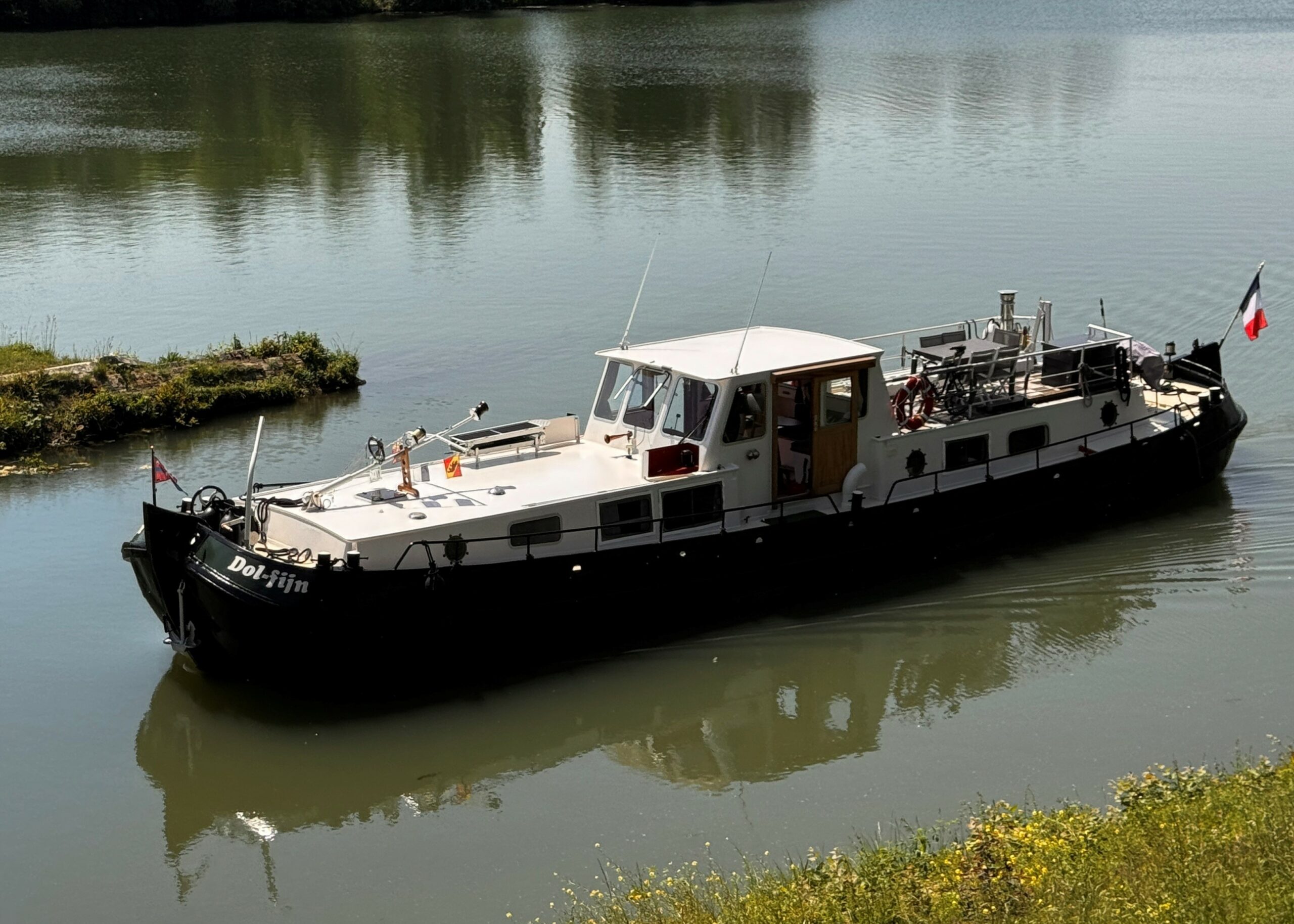 Dieser wunderschöne, 19 Meter lange Tjalk aus dem Jahr 1910 besticht durch seine Authentizität und seine großzügigen Abmessungen. Er verfügt über eine große, mit einer Sonnenplane überdachte Terrasse sowie ein Steuerhaus mit zwei Seitentüren. Im Inneren befinden sich ein geräumiger Salon mit Einbauküche und zwei Doppelkabinen im Bug, die jeweils über ein separates WC und eine Dusche verfügen. Zahlreiche Stauräume optimieren den Wohnraum.