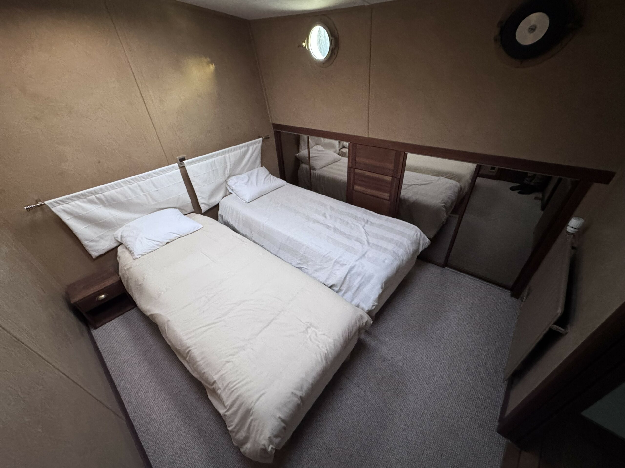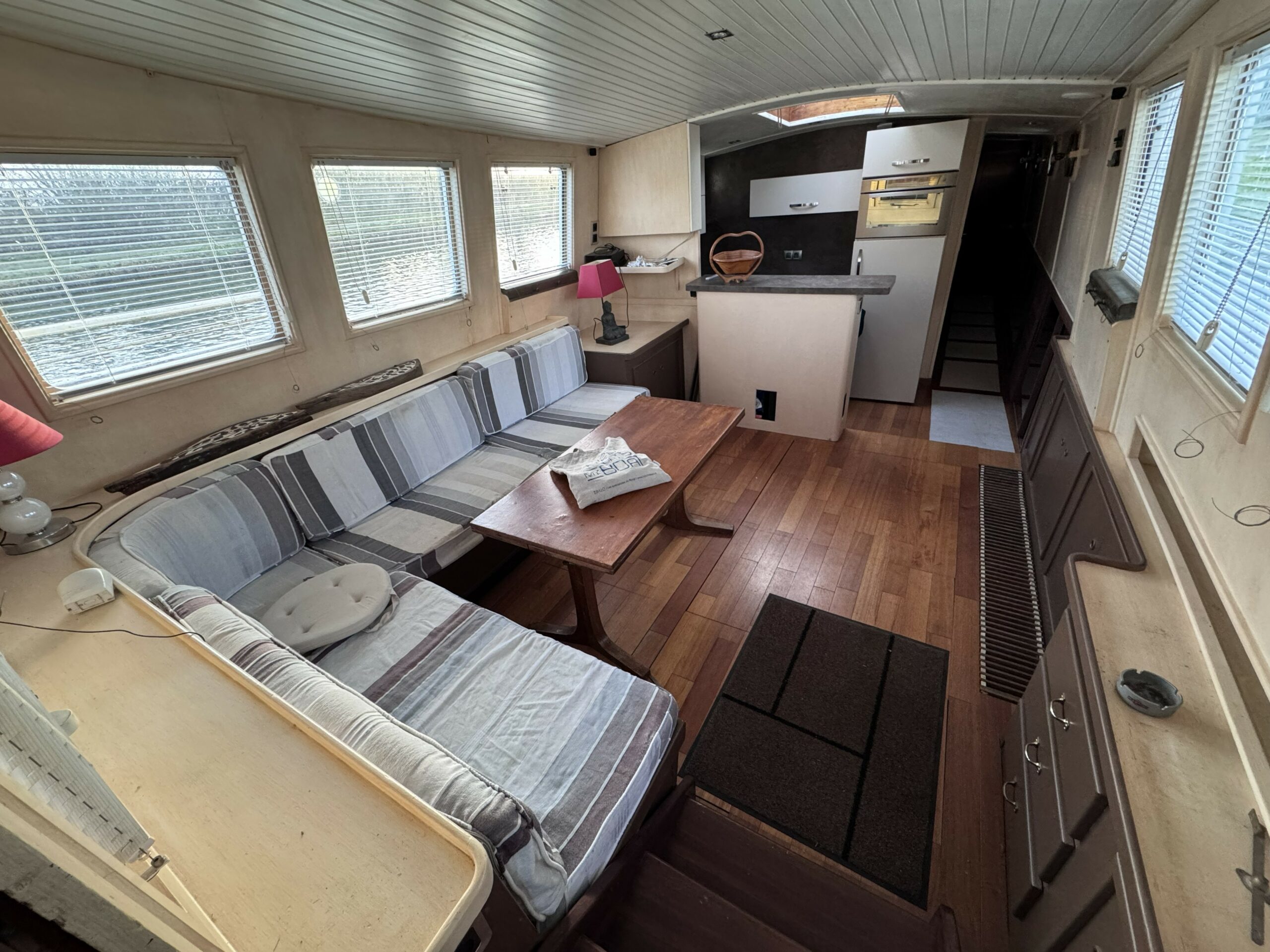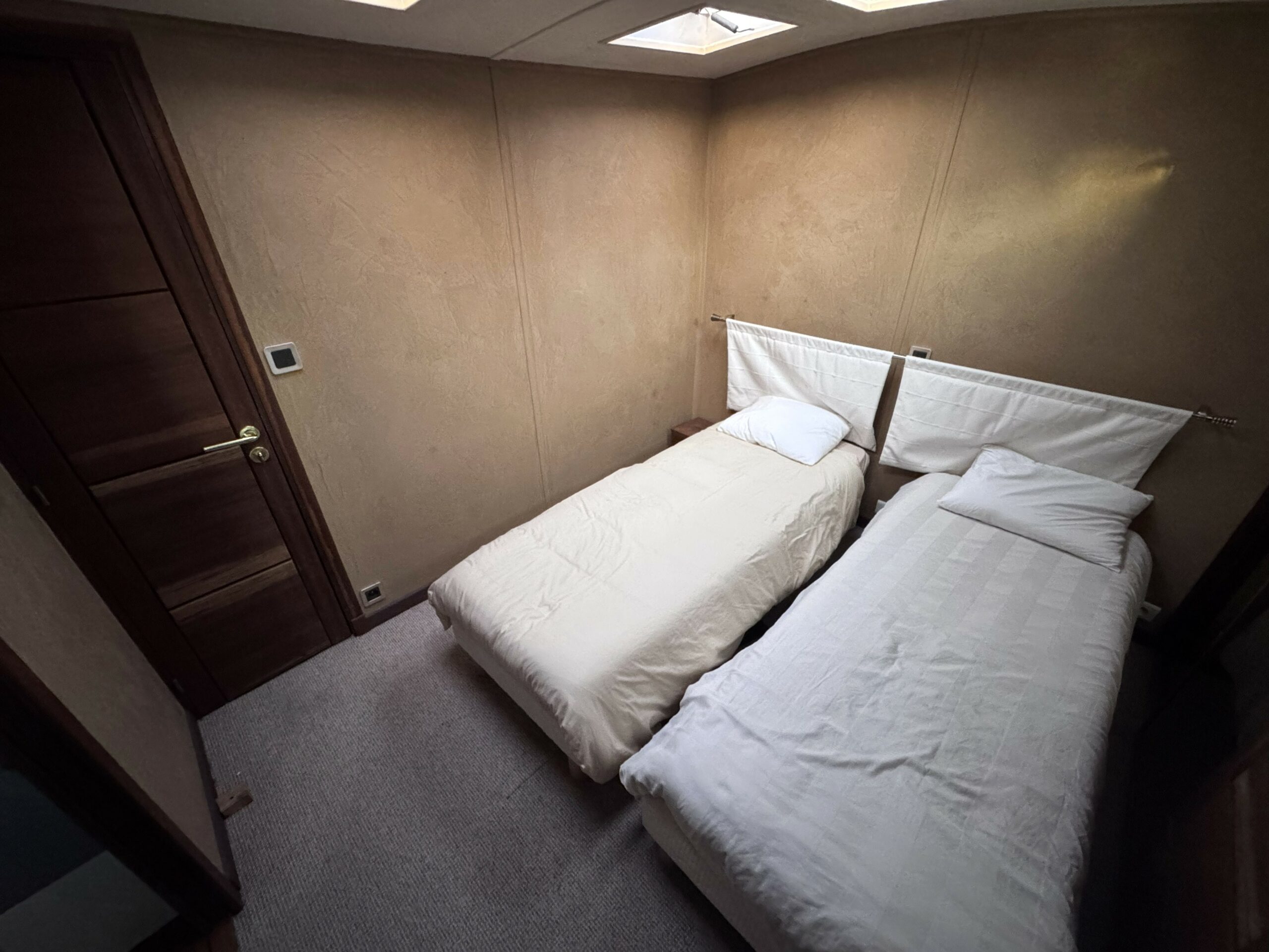 Das geräumige Steuerhaus öffnet sich zu einer großen, überdachten Außenterrasse. Im Inneren finden Sie einen hellen und großzügigen Wohn- und Essbereich sowie zwei komfortable Kabinen – eine Doppel- und eine flexible Kabine mit umwandelbaren Betten –, jeweils mit eigenem Bad, Dusche und WC.