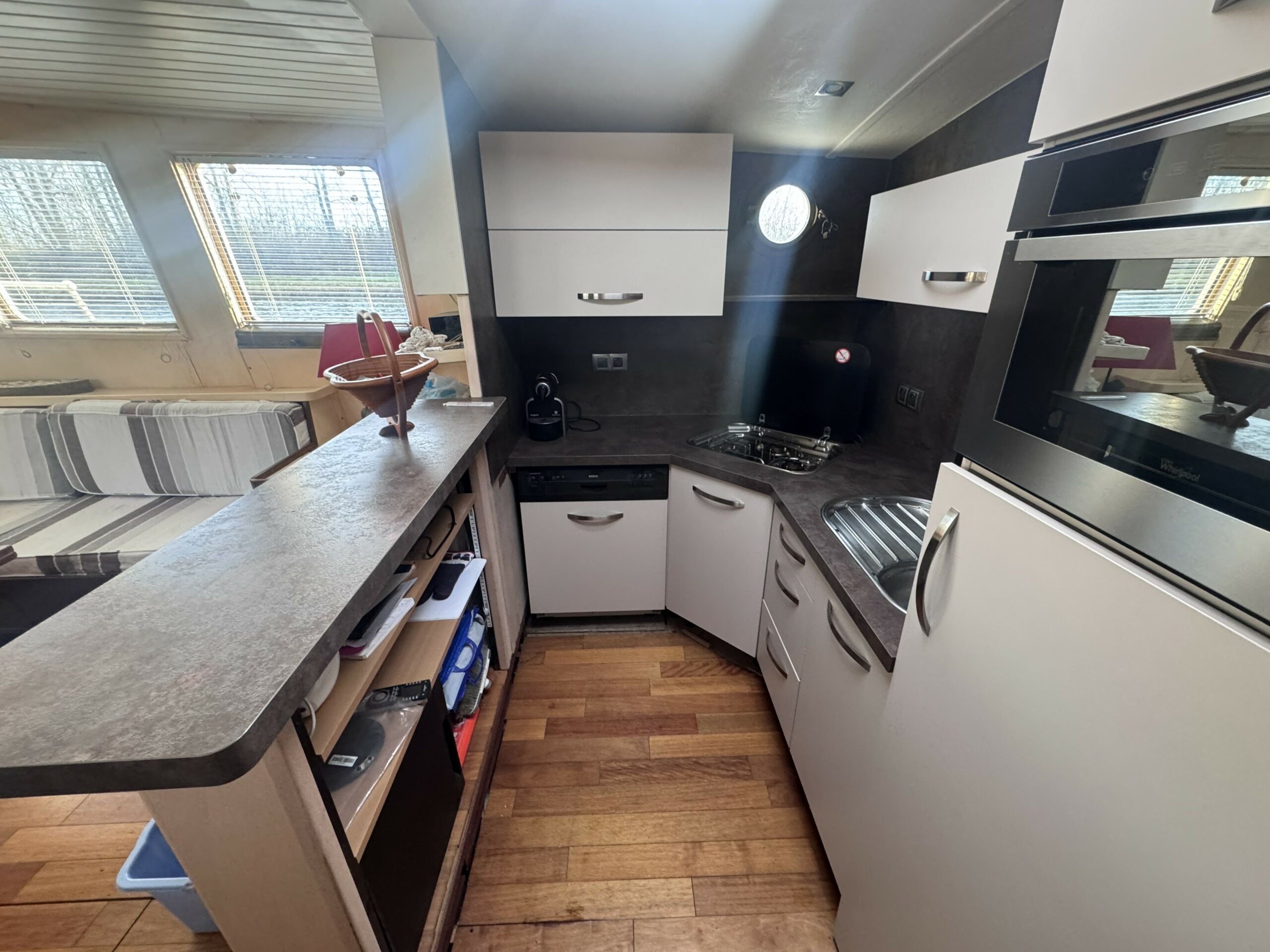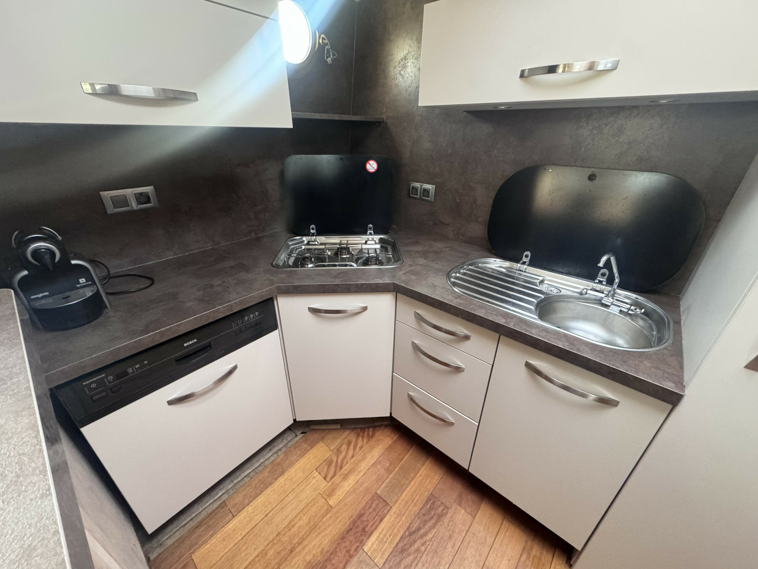 Die Küche ist voll ausgestattet und bietet alles, was Sie zum Kochen wie zu Hause benötigen: Gaskochfeld, 220V-Backofen, 220V-Kühlschrank, Gefrierschrank, Mikrowelle und Geschirrspüler. Eine Waschmaschine ergänzt die Ausstattung für maximale Autonomie an Bord.