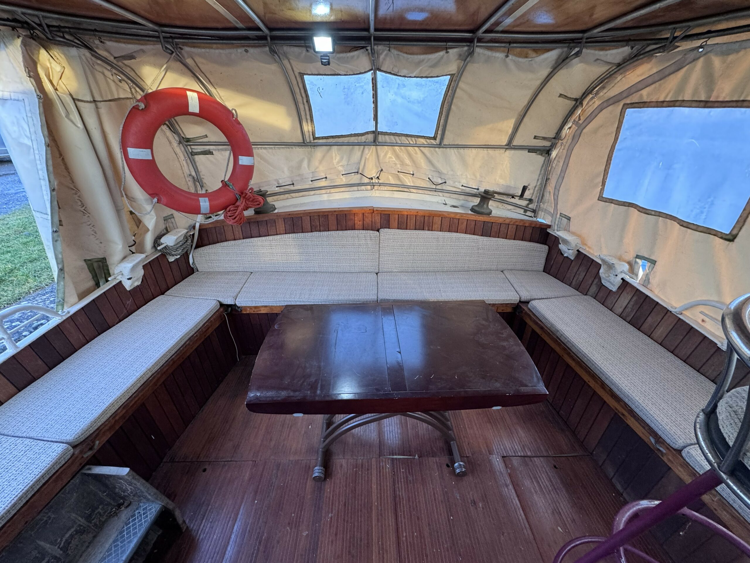 Außenausstattung : Laufsteg,Badeleiter,Sonnenverdeck,Vollständige Winterplane,Mechanische Ankerwinde,Deckwaschpumpe,Schiebedach