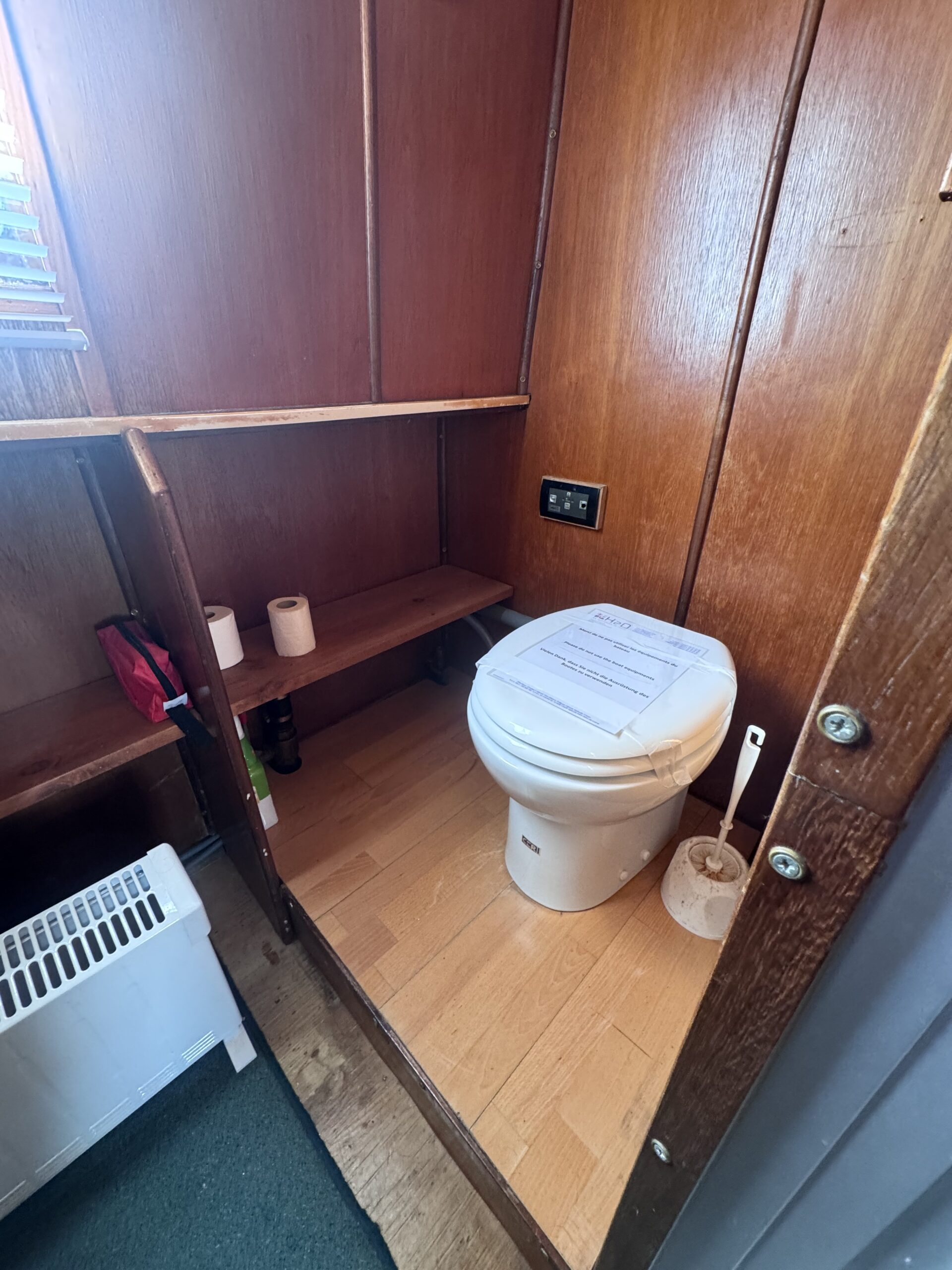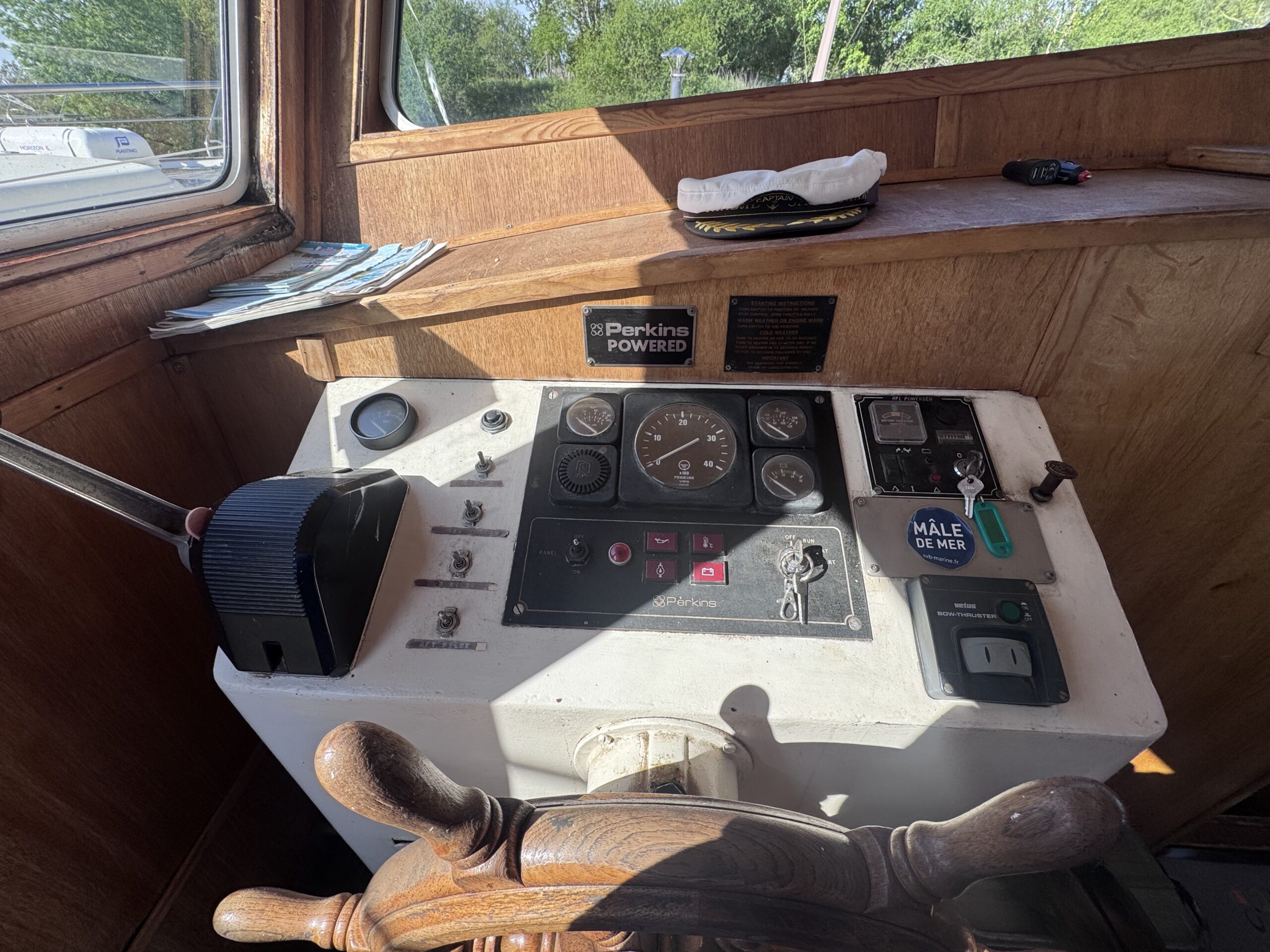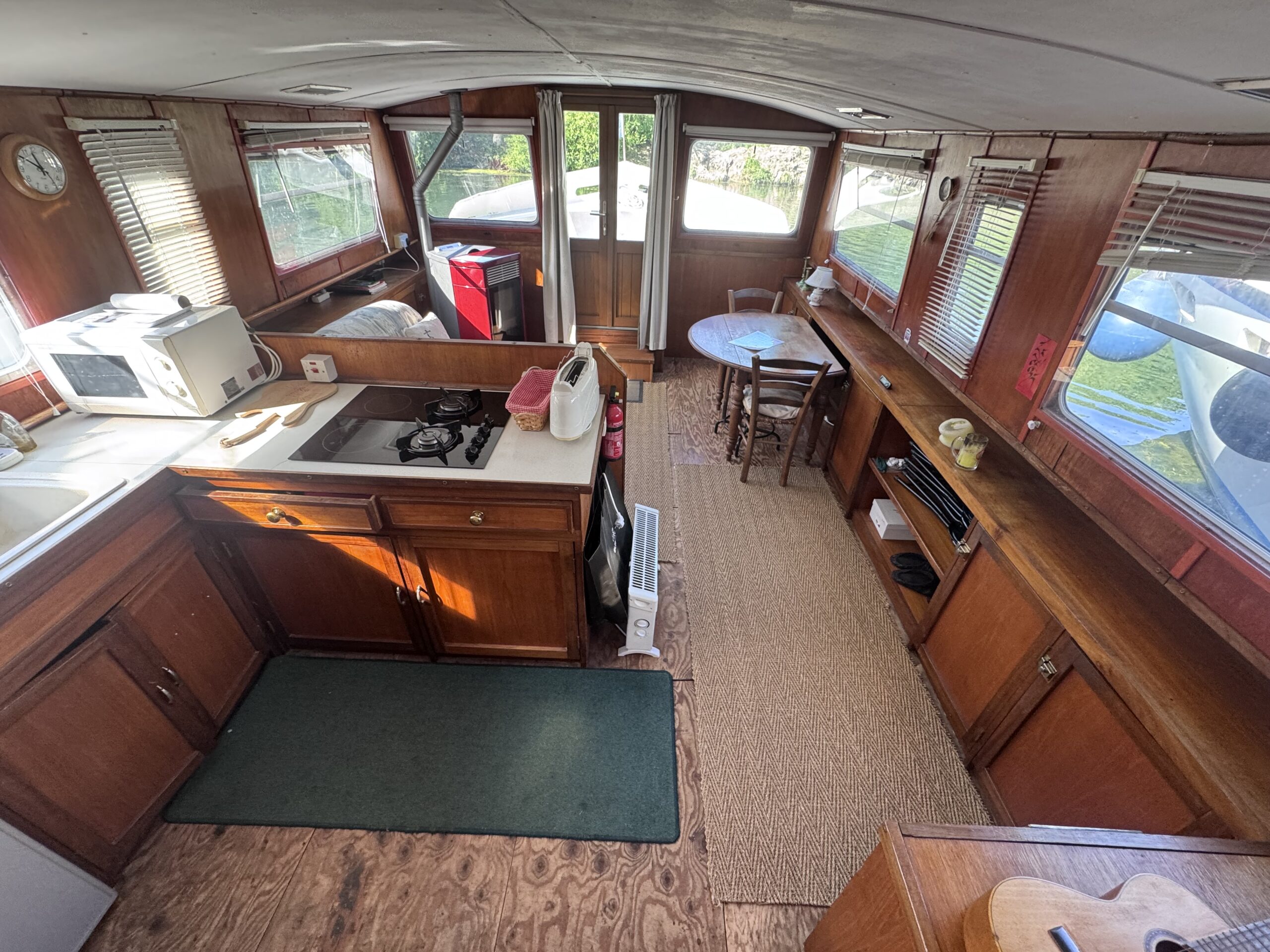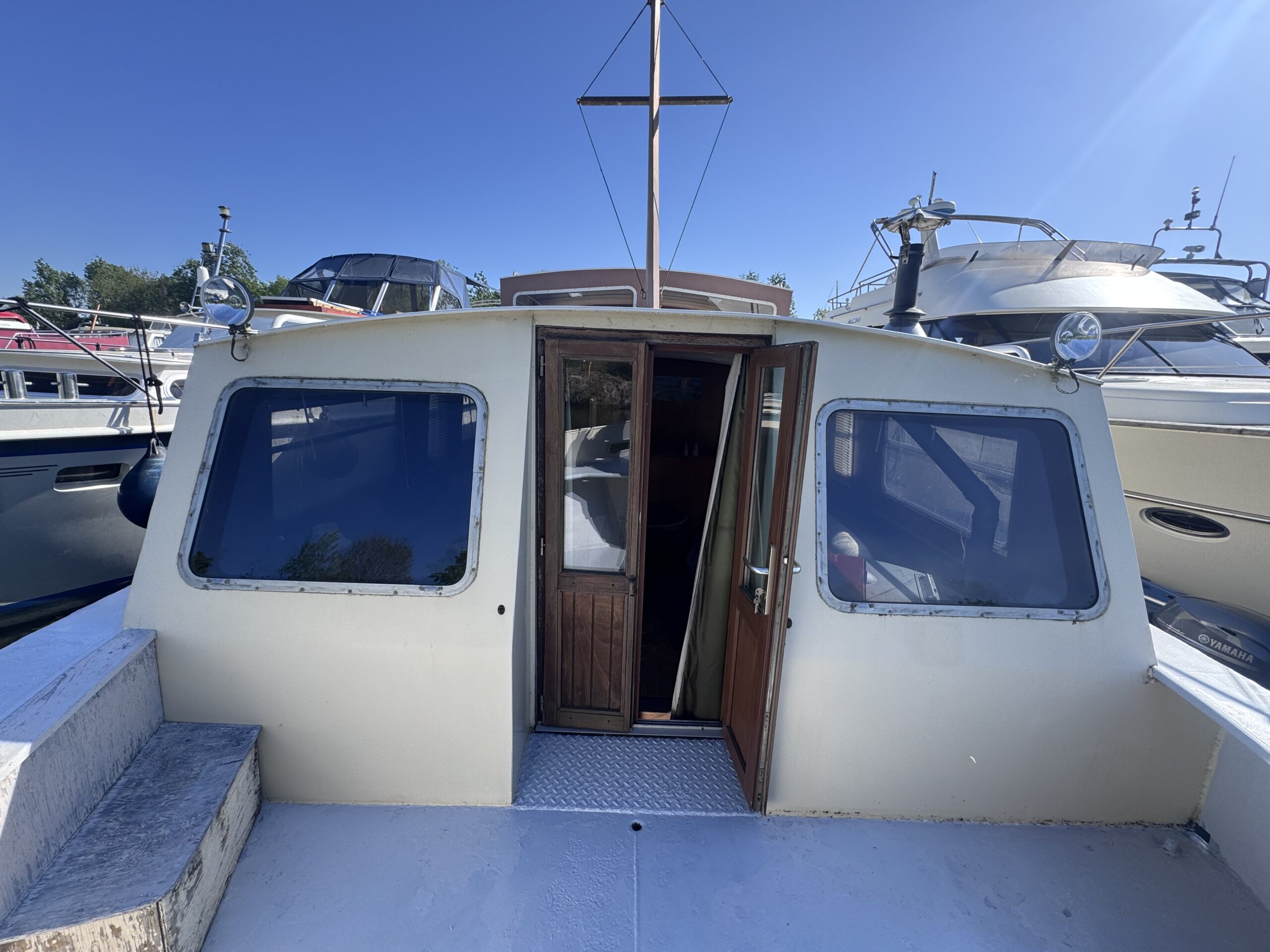 Der Innenbereich besteht aus einem Steuerhaus mit Steuerstand, einem hellen Salon mit Essbereich, einer ausgestatteten Küche mit Kochfeld, Kühlschrank und Mikrowelle sowie einer großen Achterkabine mit Doppelbett. Ein Badezimmer mit Dusche und WC rundet diesen funktionalen und angenehmen Wohnbereich ab.